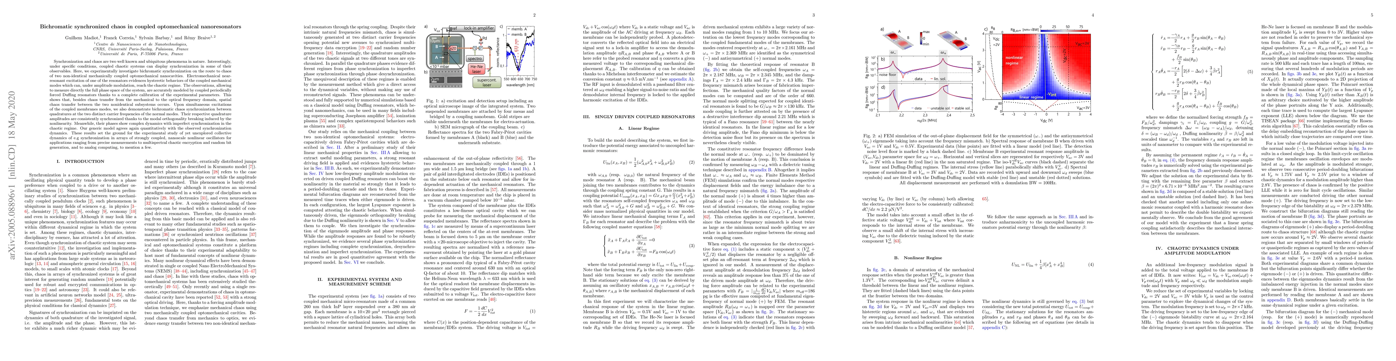 This paper investigates bichromatic synchronization and chaos in two non-identical, mechanically coupled optomechanical nanoresonators under electromechanical excitation. It finds synchronization of quadrature amplitudes at distinct carrier frequencies, alongside imperfect phase synchronization, and demonstrates potential applications in measurement, encryption, and computing.