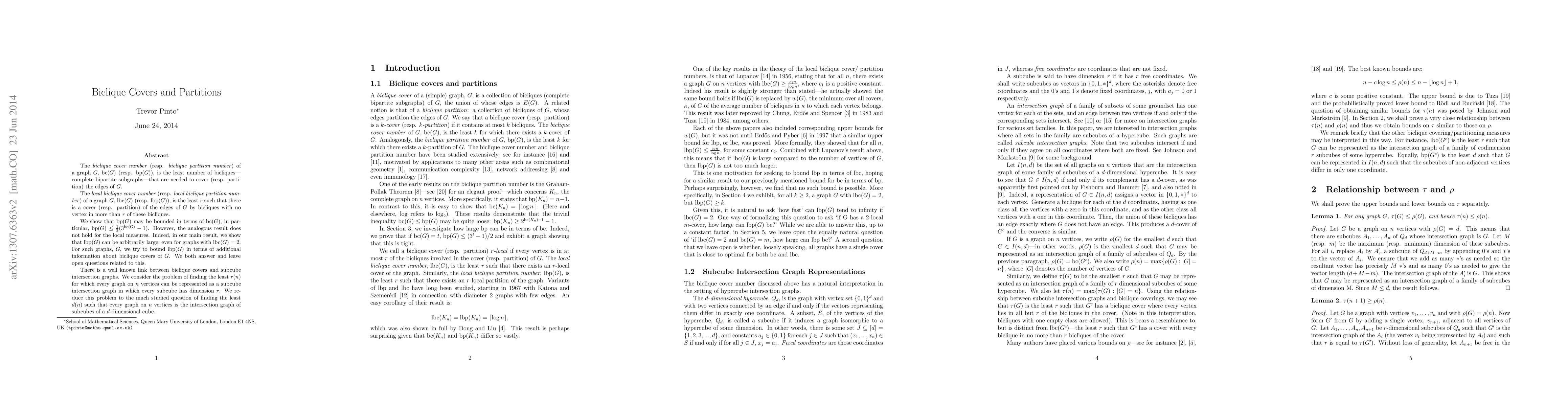 This research paper explores biclique covers and partitions in graph theory, establishing that biclique partition number (bp) can be bounded by biclique cover number (bc), specifically, bp ≤ (3^bc - 1)/2. However, the local biclique partition number (lbp) can be significantly larger, even when the local biclique cover number (lbc) is 2. The paper also investigates the relationship between biclique covers and subcube intersection graphs, reducing the problem of finding minimal subcube dimensions to a well-known graph theory problem.