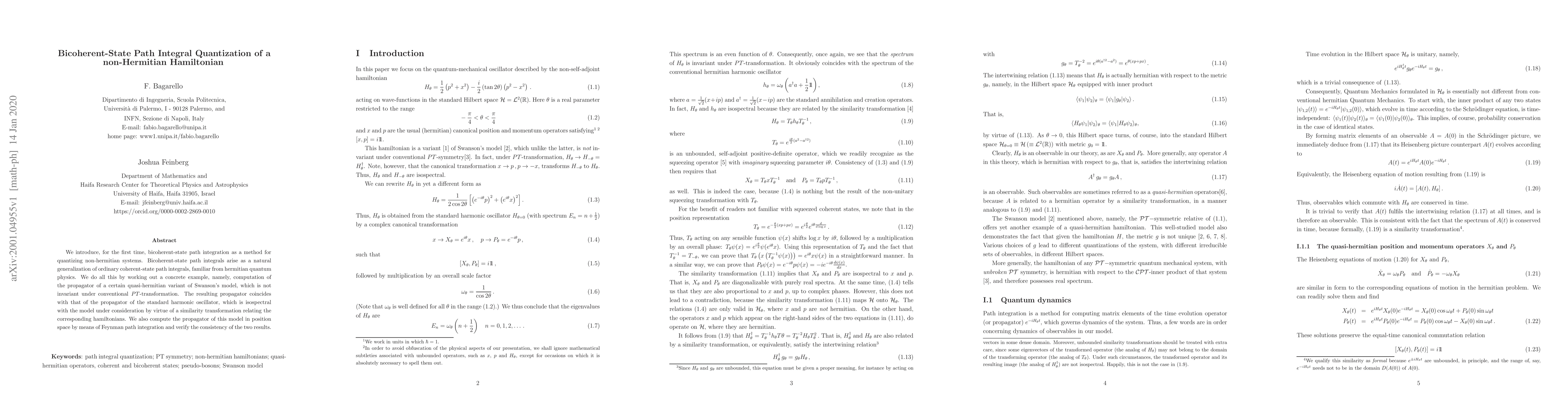 We introduce, for the first time, bicoherent-state path integration as a method for quantizing non-hermitian systems. Bicoherent-state path integrals arise as a natural generalization of ordinary coherent-state path integrals, familiar from hermitian quantum physics. We do all this by working out a concrete example, namely, computation of the propagator of a certain quasi-hermitian variant of Swanson's model, which is not invariant under conventional $PT$-transformation. The resulting propagator coincides with that of the propagator of the standard harmonic oscillator, which is isospectral with the model under consideration by virtue of a similarity transformation relating the corresponding hamiltonians. We also compute the propagator of this model in position space by means of Feynman path integration and verify the consistency of the two results.