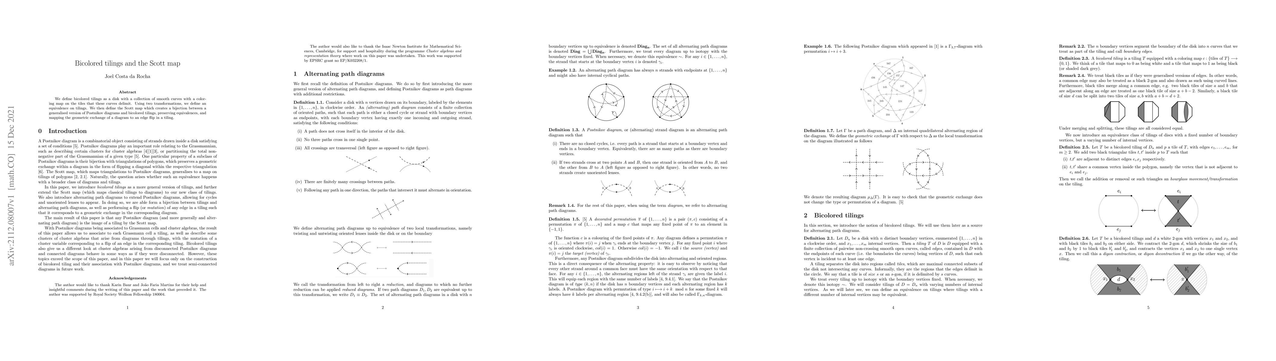 We define bicolored tilings as a disk with a collection of smooth curves with a coloring map on the tiles that these curves delimit. Using two transformations, we define an equivalence on tilings. We then define the Scott map which creates a bijection between a generalised version of Postnikov diagrams and bicolored tilings, preserving equivalences, and mapping the geometric exchange of a diagram to an edge flip in a tiling.