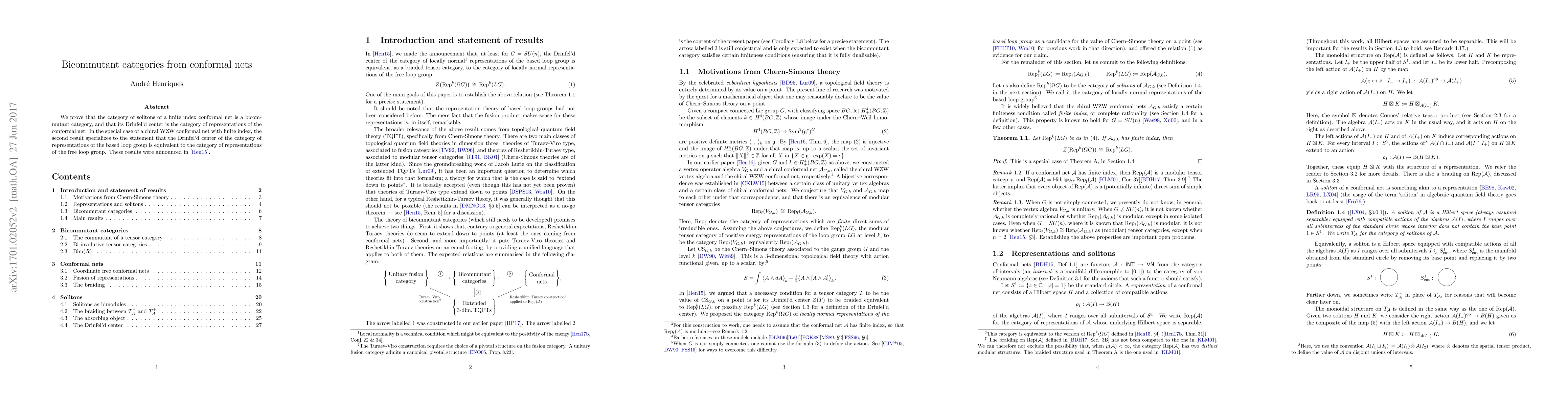 We prove that the category of solitons of a finite index conformal net is a bicommutant category, and that its Drinfel'd center is the category of representations of the conformal net. In the special case of a chiral WZW conformal net with finite index, the second result specializes to the statement that the Drinfel'd center of the category of representations of the based loop group is equivalent to the category of representations of the free loop group. These results were announced in [arXiv:1503.06254].