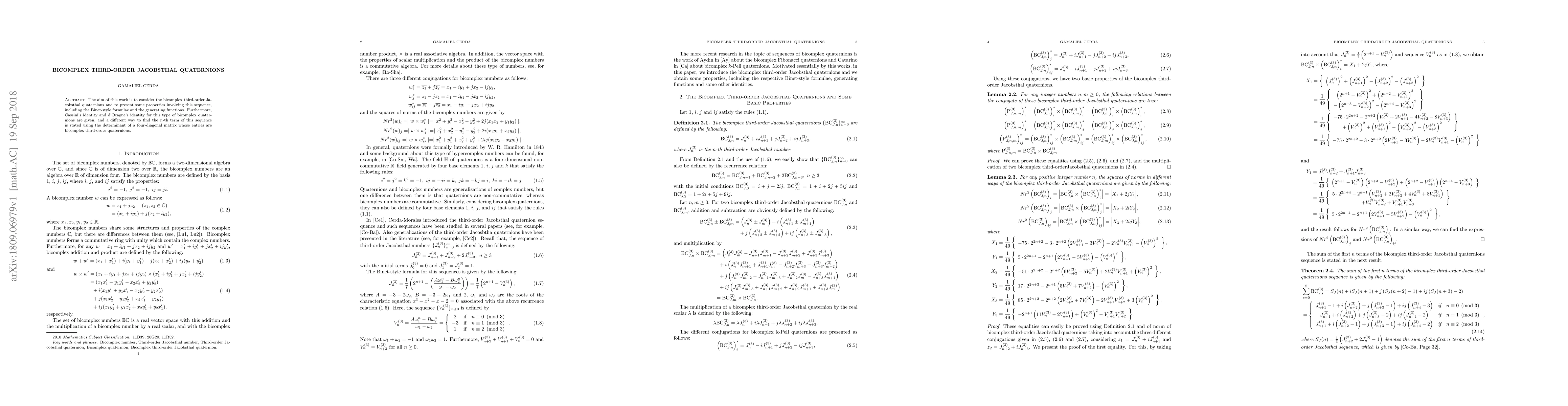 This paper explores bicomplex third-order Jacobsthal quaternions, presenting Binet-style formulae and generating functions. It also discusses Cassini's and d'Ocagne's identities for these quaternions and introduces a method to find the n-th term using the determinant of a four-diagonal matrix.