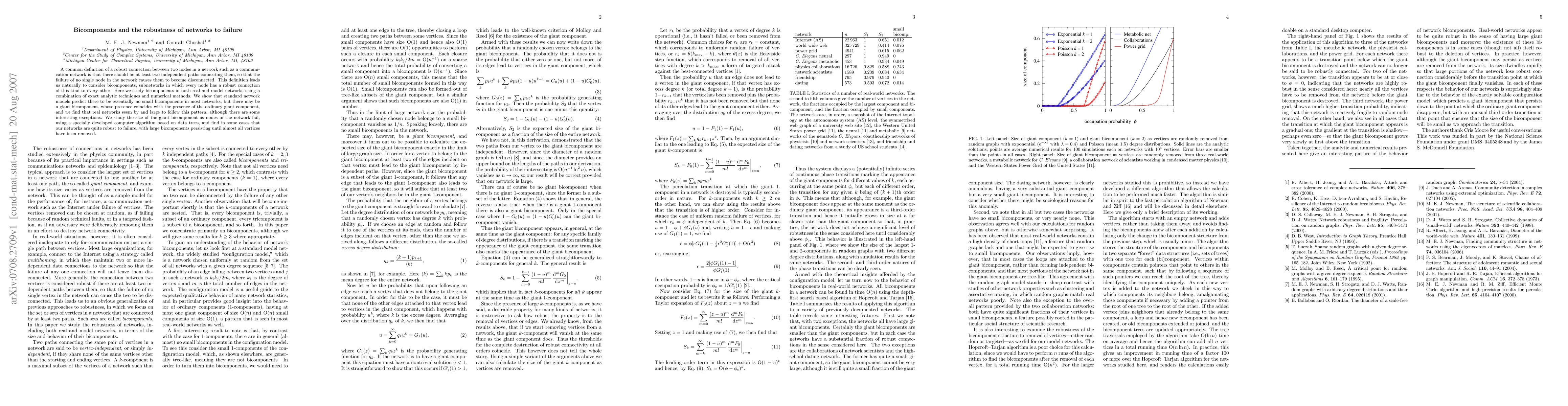 A common definition of a robust connection between two nodes in a network such as a communication network is that there should be at least two independent paths connecting them, so that the failure of no single node in the network causes them to become disconnected. This definition leads us naturally to consider bicomponents, subnetworks in which every node has a robust connection of this kind to every other. Here we study bicomponents in both real and model networks using a combination of exact analytic techniques and numerical methods. We show that standard network models predict there to be essentially no small bicomponents in most networks, but there may be a giant bicomponent, whose presence coincides with the presence of the ordinary giant component, and we find that real networks seem by and large to follow this pattern, although there are some interesting exceptions. We study the size of the giant bicomponent as nodes in the network fail, using a specially developed computer algorithm based on data trees, and find in some cases that our networks are quite robust to failure, with large bicomponents persisting until almost all vertices have been removed.