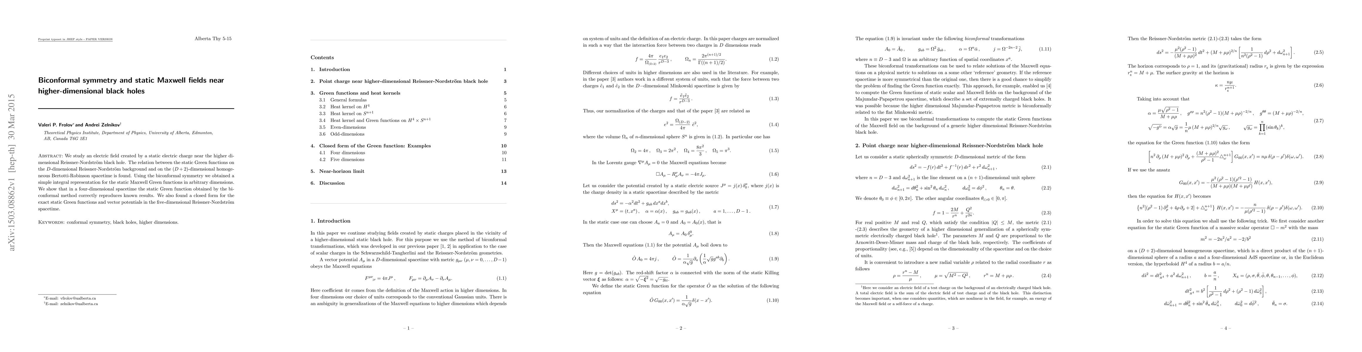 We study an electric field created by a static electric charge near the higher dimensional Reissner-Nordstrom black hole. The relation between the static Green functions on the D-dimensional Reissner-Nordstrom background and on the (D+2)-dimensional homogeneous Bertotti-Robinson spacetime is found. Using the biconformal symmetry we obtained a simple integral representation for the static Maxwell Green functions in arbitrary dimensions. We show that in a four-dimensional spacetime the static Green function obtained by the biconformal method correctly reproduces known results. We also found a closed form for the exact static Green functions and vector potentials in the five-dimensional Reissner-Nordstrom spacetime.