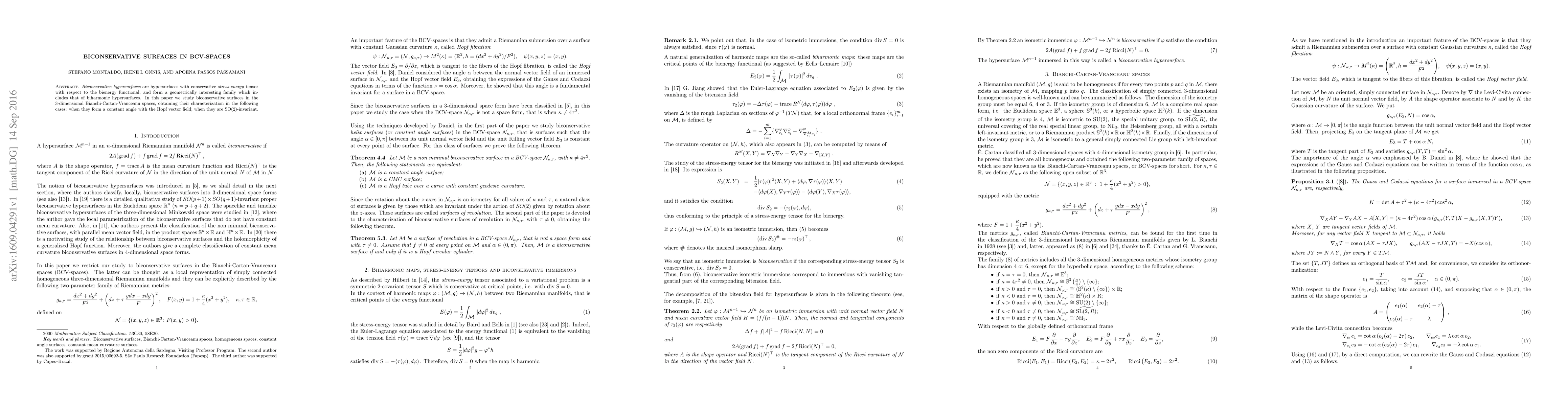 Summary: The paper characterizes biconservative surfaces in 3-dimensional Bianchi-Cartan-Vranceanu spaces, focusing on those maintaining a constant angle with the Hopf vector field and those invariant under SO(2) transformations. These surfaces are distinguished by their conservative stress-energy tensor.