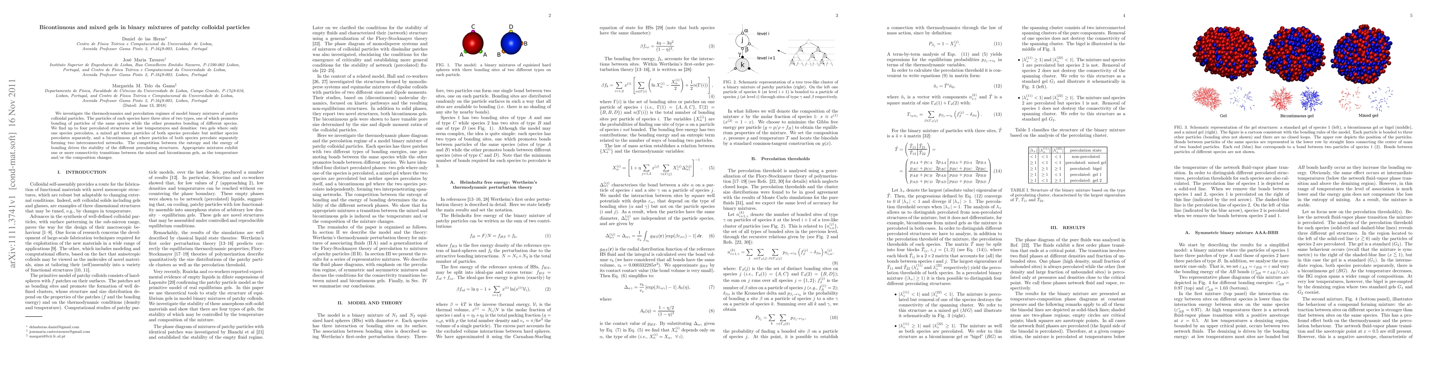 This paper explores the thermodynamic and percolation behaviors of binary mixtures of patchy colloidal particles, revealing four distinct percolated structures: two single-species gels, a mixed gel, and a bicontinuous gel. The stability and transitions between these structures are driven by the interplay between bonding energy and entropy.