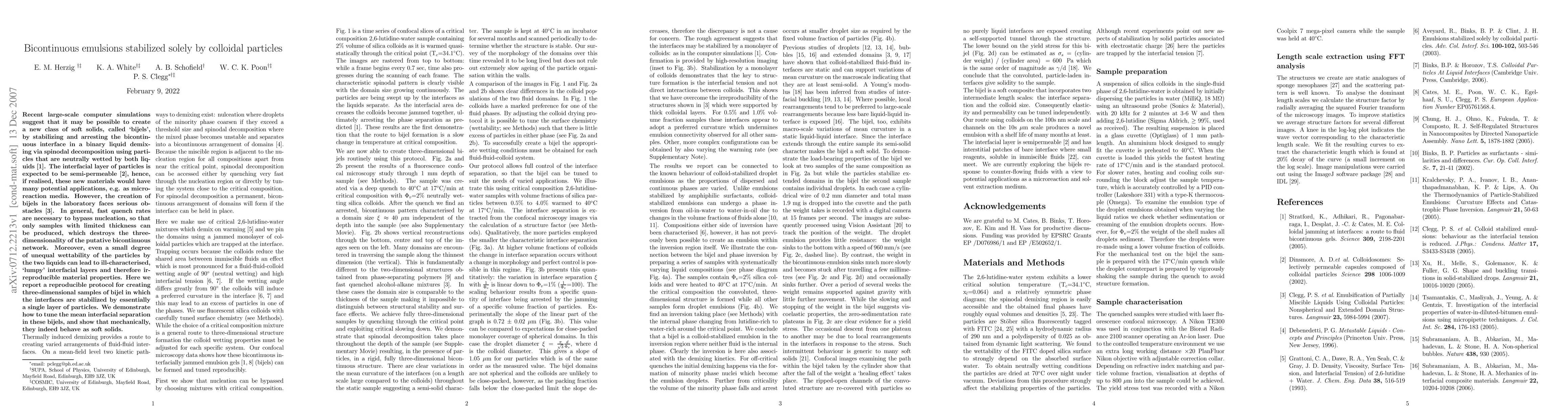 This paper presents a reproducible method for creating three-dimensional bicontinuous emulsions, termed bijels, stabilized by a single layer of colloidal particles. The study demonstrates the ability to tune the mean interfacial separation and confirms that these materials behave mechanically as soft solids, overcoming previous laboratory production challenges.