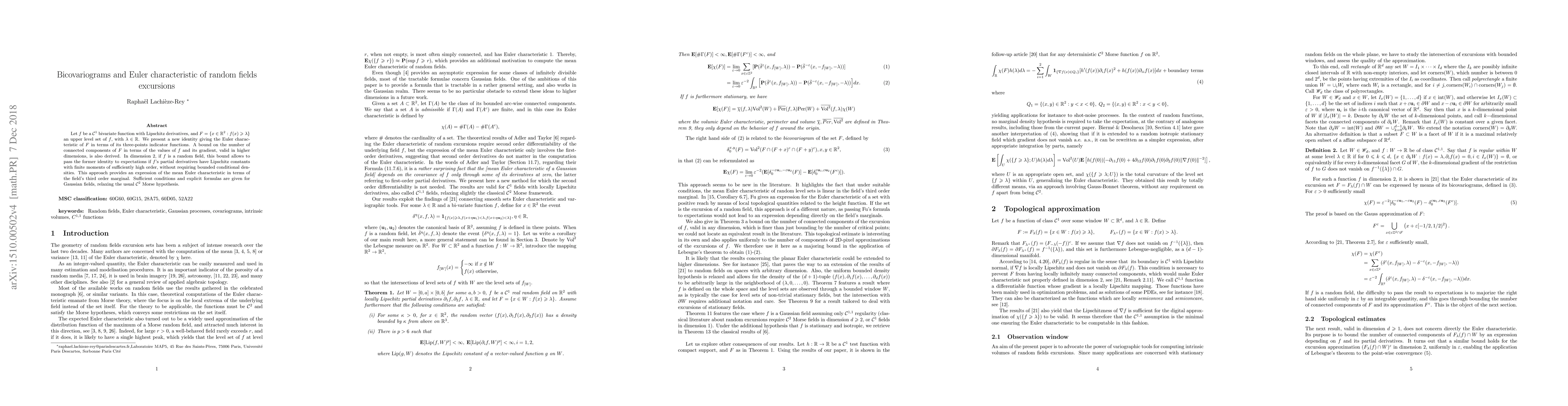 Let f be a C1 bivariate function with Lipschitz derivatives, and F = {x $\in$ R2 : f(x) $\lambda$} an upper level set of f, with $\lambda$ $\in$ R. We present a new identity giving the Euler characteristic of F in terms of its three-points indicator functions. A bound on the number of connected components of F in terms of the values of f and its gradient, valid in higher dimensions, is also derived. In dimension 2, if f is a random field, this bound allows to pass the former identity to expectations if f's partial derivatives have Lipschitz constants with finite moments of sufficiently high order, without requiring bounded conditional densities. This approach provides an expression of the mean Euler characteristic in terms of the field's third order marginal. Sufficient conditions and explicit formulas are given for Gaussian fields, relaxing the usual C2 Morse hypothesis.