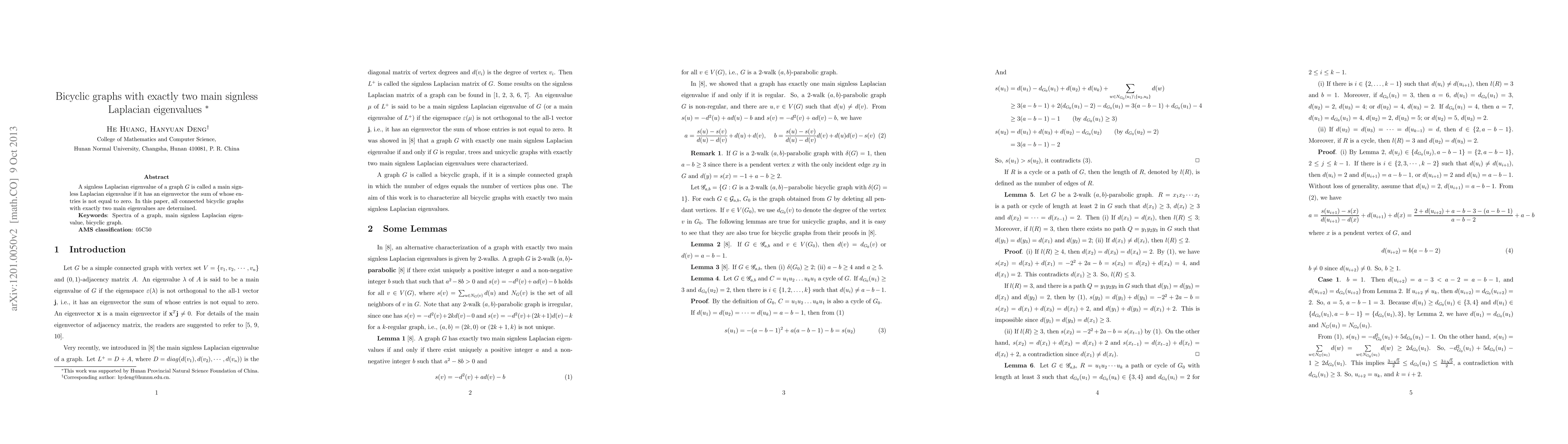 This paper identifies all connected bicyclic graphs that possess exactly two main signless Laplacian eigenvalues, where a main eigenvalue has a non-zero sum of eigenvector entries. The study focuses on the structural properties distinguishing these graphs from others within the bicyclic class.