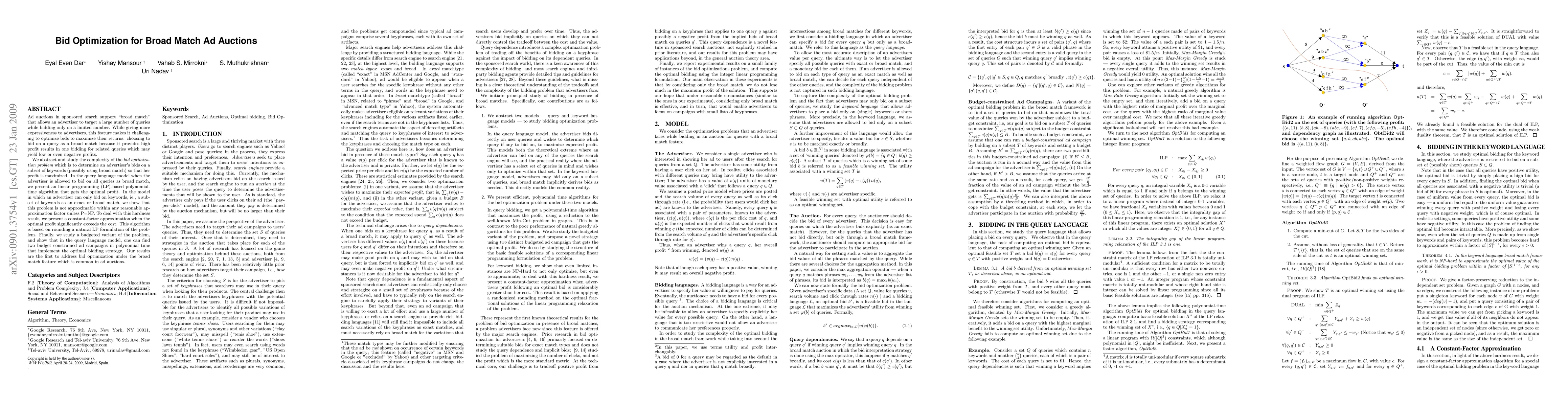 This paper studies the bid optimization problem in broad-match ad auctions, presenting a linear programming algorithm for optimal profit maximization when advertisers can bid on all queries broadly. It proves the problem is intractable for constrained keyword bidding unless P=NP, and provides a constant-factor approximation for practical scenarios.