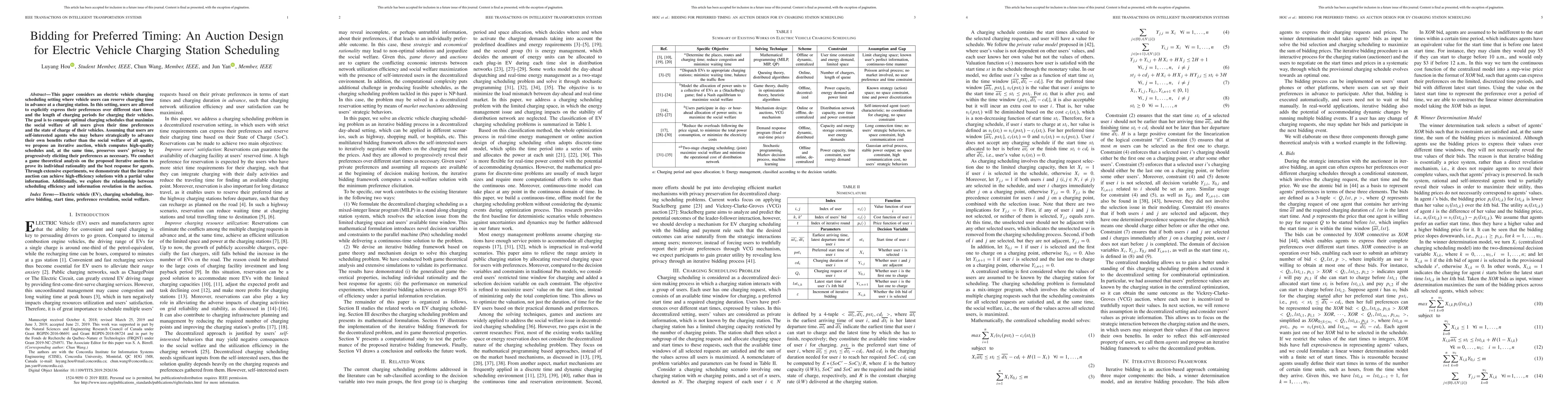 This paper proposes an iterative auction design to schedule electric vehicle charging times based on user preferences, aiming to maximize social welfare while preserving user privacy. The auction's game-theoretic analysis confirms its individual rationality and best response properties, and experiments show it achieves high efficiency with partial information.