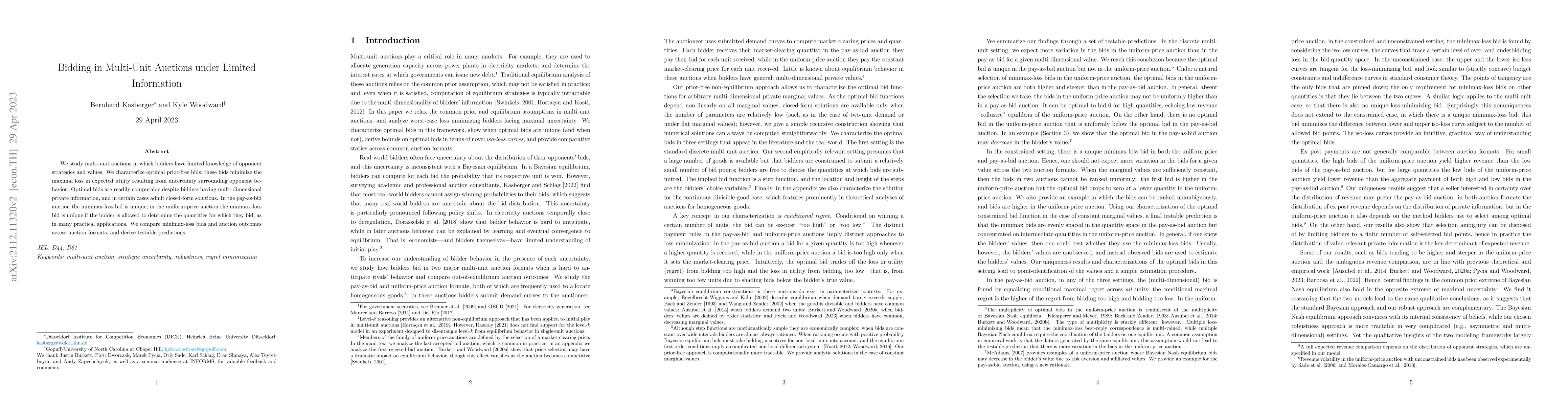 This paper investigates optimal bidding strategies in multi-unit auctions where bidders have limited information about opponents' strategies and values. It proposes prior-free bids that minimize potential losses due to uncertainty, providing computable solutions even with complex private information.