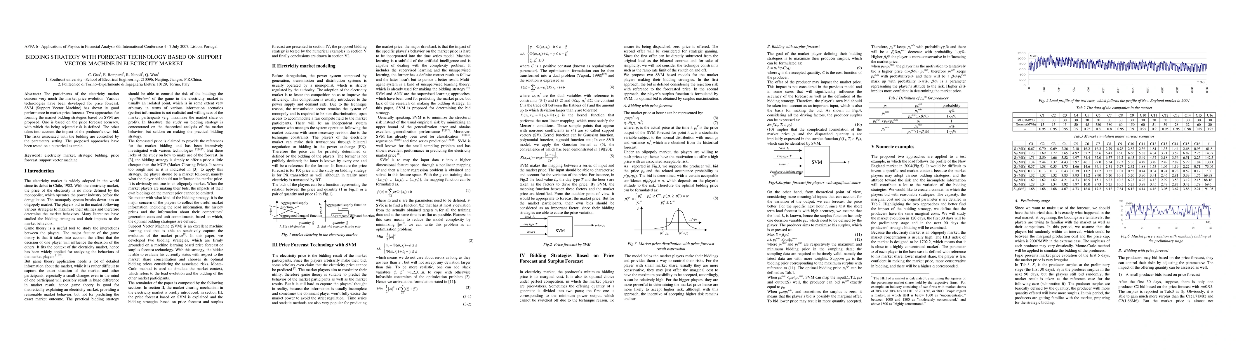 This paper proposes two bidding strategy approaches for electricity market participants using SVM for price forecasting, aiming to minimize rejection risks and control bidding-related risks through parameter settings. The effectiveness of the strategies is demonstrated through a numerical example.