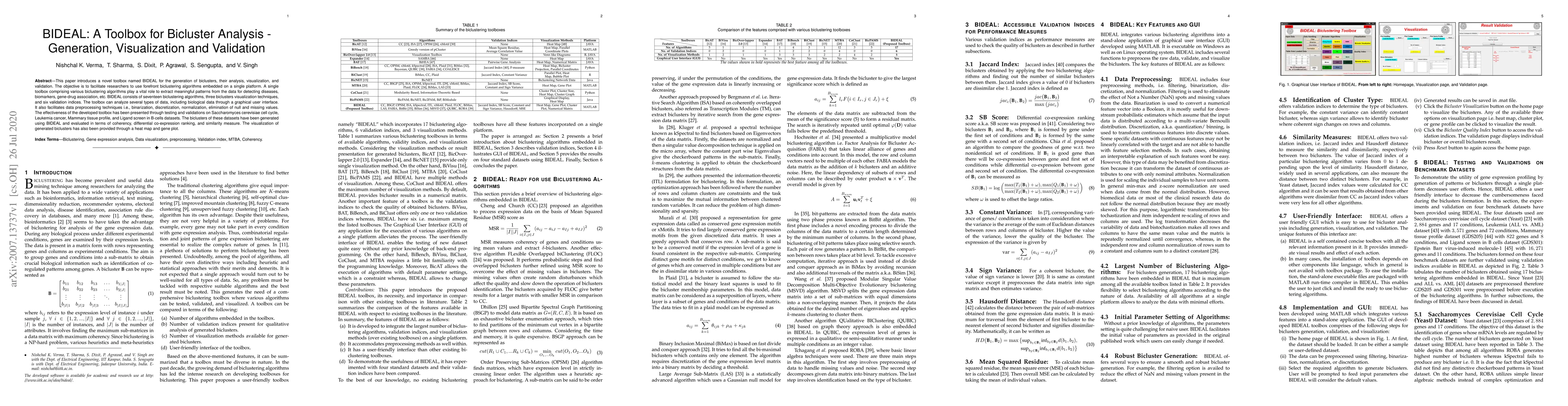 BIDEAL is a comprehensive toolbox for bicluster analysis, integrating seventeen algorithms, three visualization techniques, and six validation indices to facilitate the extraction of meaningful patterns from data, particularly in biological research. It supports data preprocessing and has been validated on various datasets, demonstrating its effectiveness in generating and visualizing biclusters.