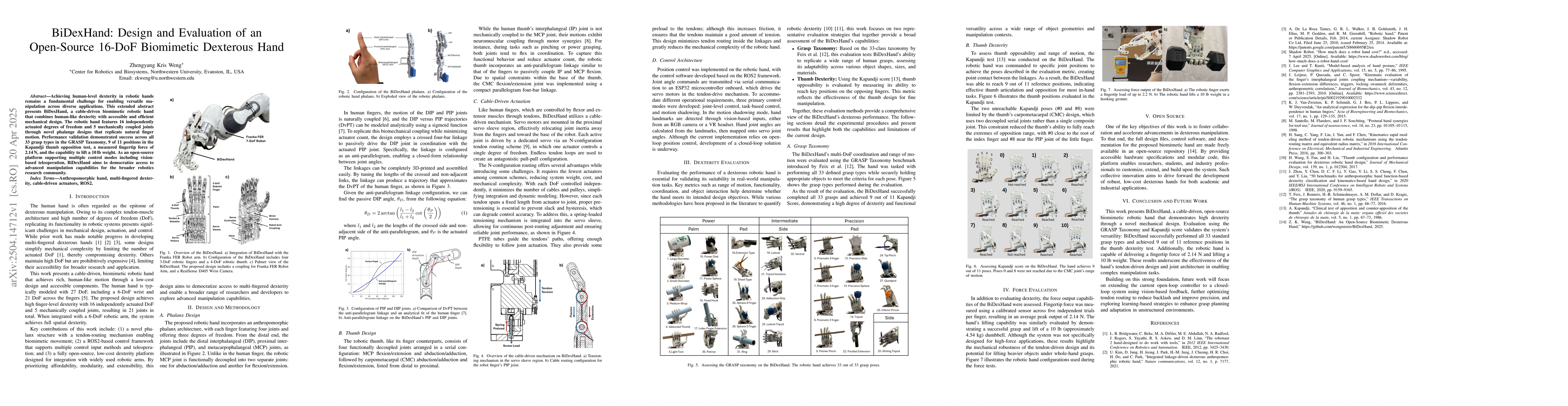 BiDexHand is a 16-DoF biomimetic robotic hand designed to replicate human dexterity, validated through successful performance in diverse grasp types and manipulation tasks. As an open-source project, it aims to provide versatile manipulation capabilities to the robotics research community.