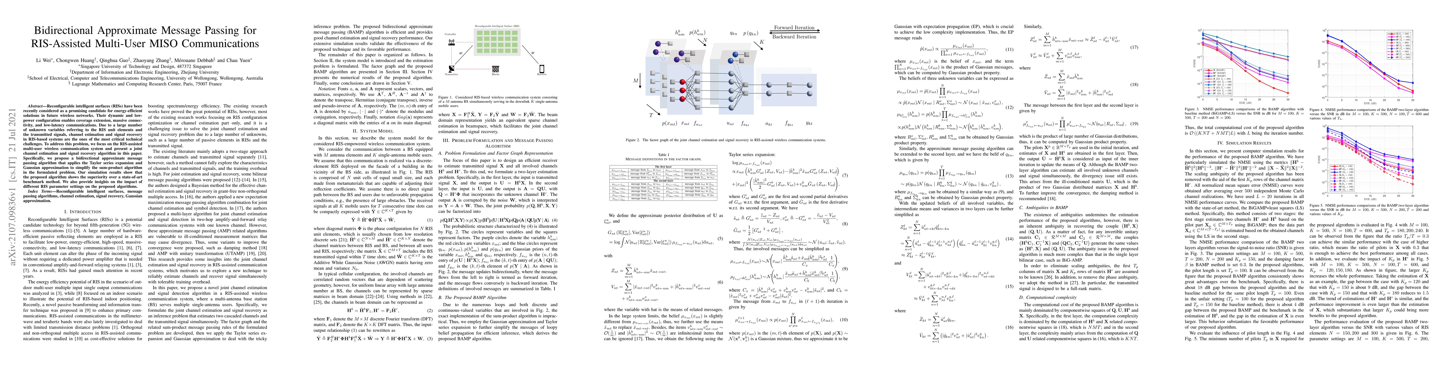 This paper proposes a bidirectional approximate message passing algorithm for channel estimation and signal recovery in RIS-assisted multi-user MISO communications. The method simplifies the sum-product algorithm using Taylor series expansion and Gaussian approximation, demonstrating superior performance compared to existing benchmarks.
