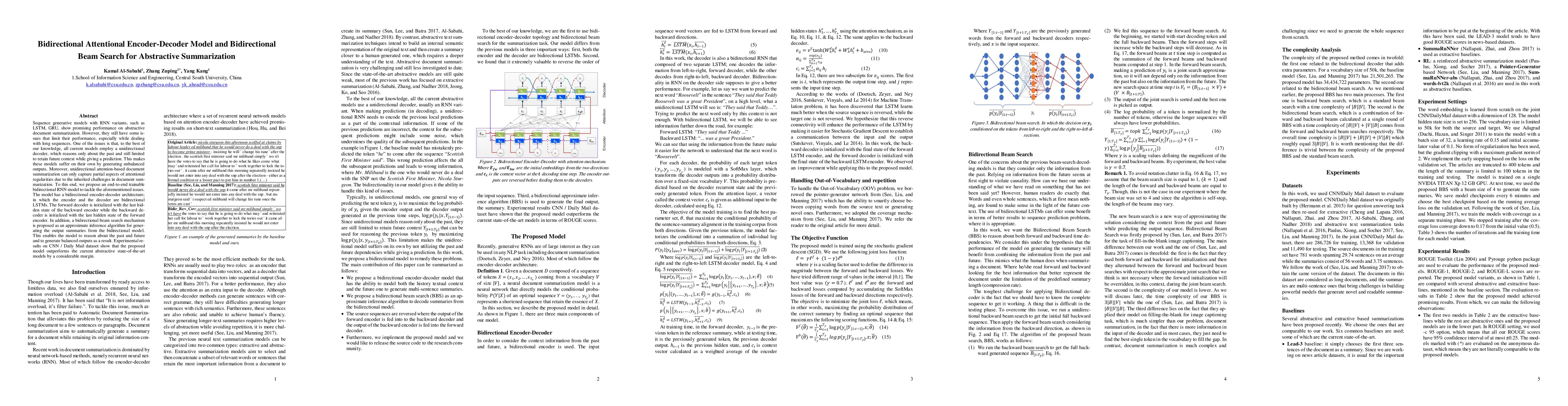 This research paper proposes a bidirectional attentional encoder-decoder model with a bidirectional beam search for abstractive summarization. The model addresses limitations of existing unidirectional decoders by incorporating bidirectional LSTMs in both the encoder and decoder, enabling it to reason about both past and future contexts, resulting in more balanced summaries. Experimental results demonstrate superior performance compared to current state-of-the-art models on the CNN/Daily Mail dataset.