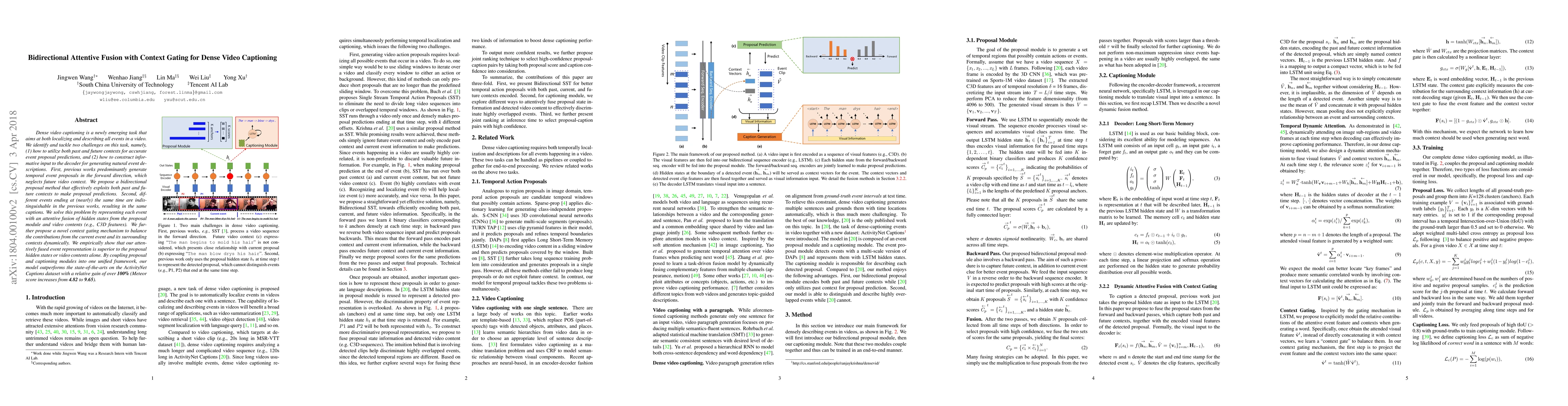 This paper proposes a bidirectional attentive fusion method with context gating for dense video captioning, addressing the challenges of utilizing both past and future contexts for event proposal predictions and generating natural event descriptions. The model outperforms state-of-the-art methods on the ActivityNet Captions dataset, achieving a significant improvement in caption quality.