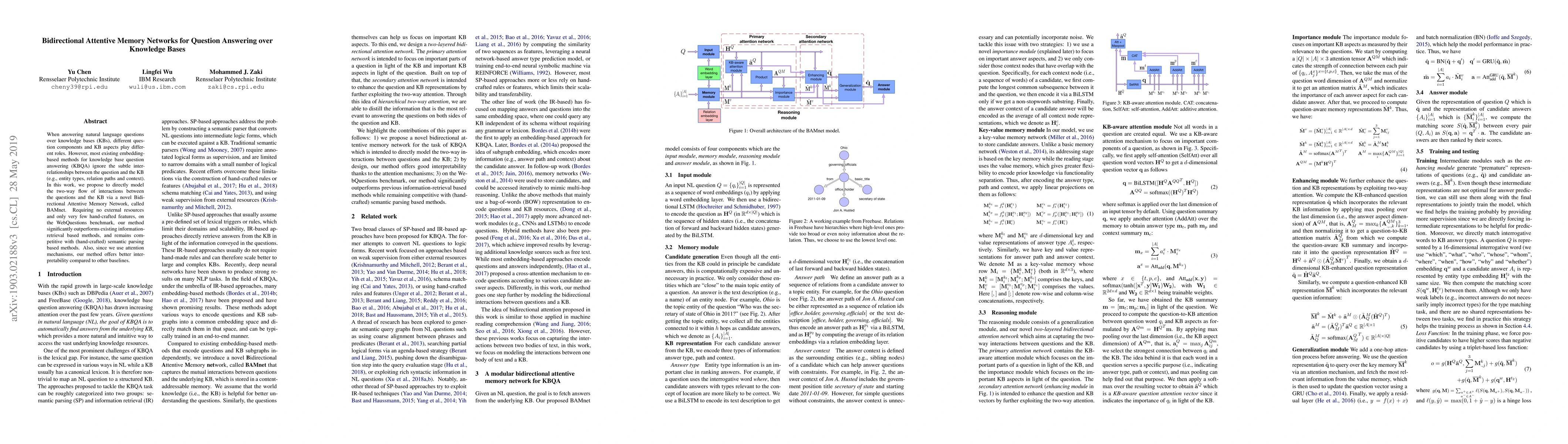 This paper proposes BAMnet, a Bidirectional Attentive Memory Network, to improve question answering over knowledge bases by modeling interactions between questions and KBs. It outperforms existing methods on the WebQuestions benchmark and offers better interpretability through attention mechanisms.