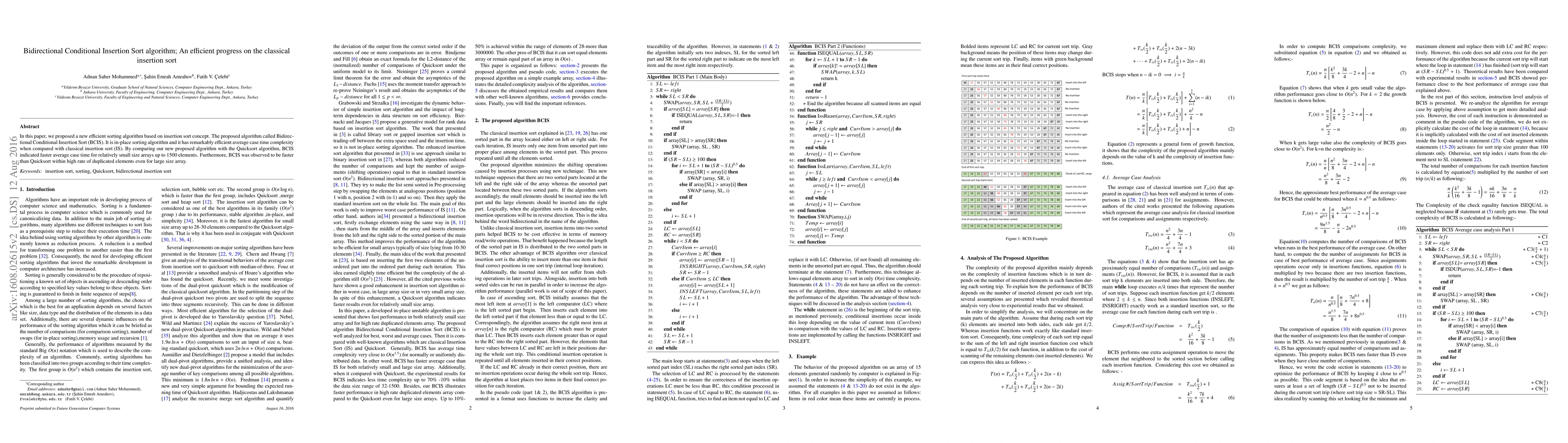 Summary: This paper introduces the Bidirectional Conditional Insertion Sort (BCIS), an in-place sorting algorithm that outperforms classical insertion sort in average case time complexity. BCIS also shows faster average case performance than Quicksort for small to medium-sized arrays and in cases with high duplication rates.