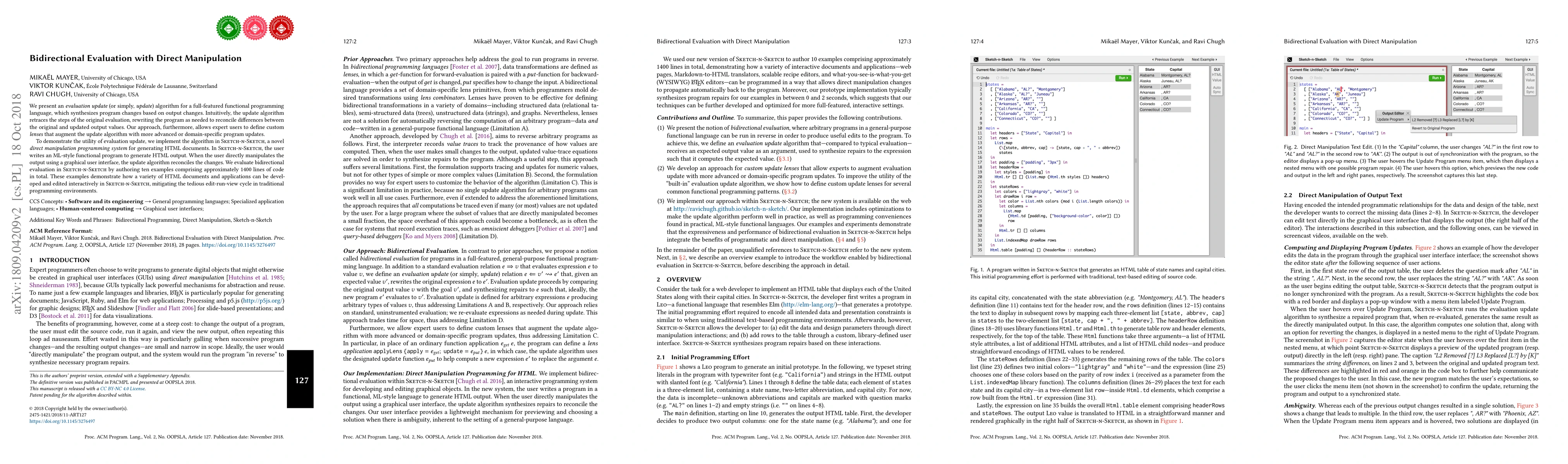 This paper introduces an evaluation update algorithm for functional programming languages that synthesizes program changes based on output modifications, allowing for bidirectional evaluation. The algorithm is implemented in Sketch-n-Sketch, a direct manipulation system for generating HTML documents, demonstrating its ability to reconcile user-driven output changes interactively.