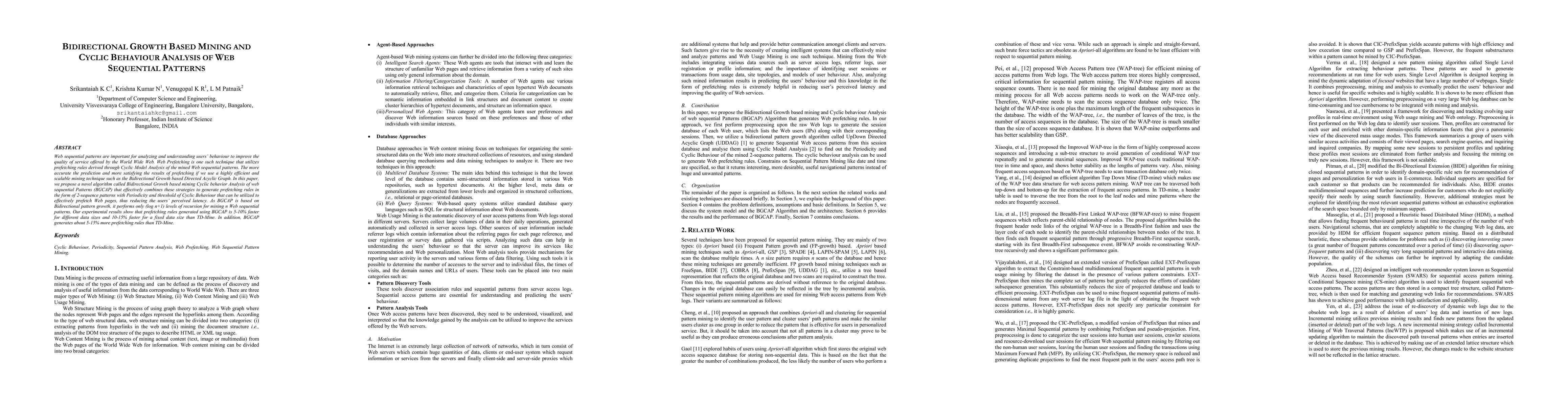The paper proposes BGCAP, an algorithm that mines Web sequential patterns using Bidirectional Growth based Directed Acyclic Graph (UDDAG) and analyzes them using Cyclic Model Analysis (CMA) to generate prefetching rules.