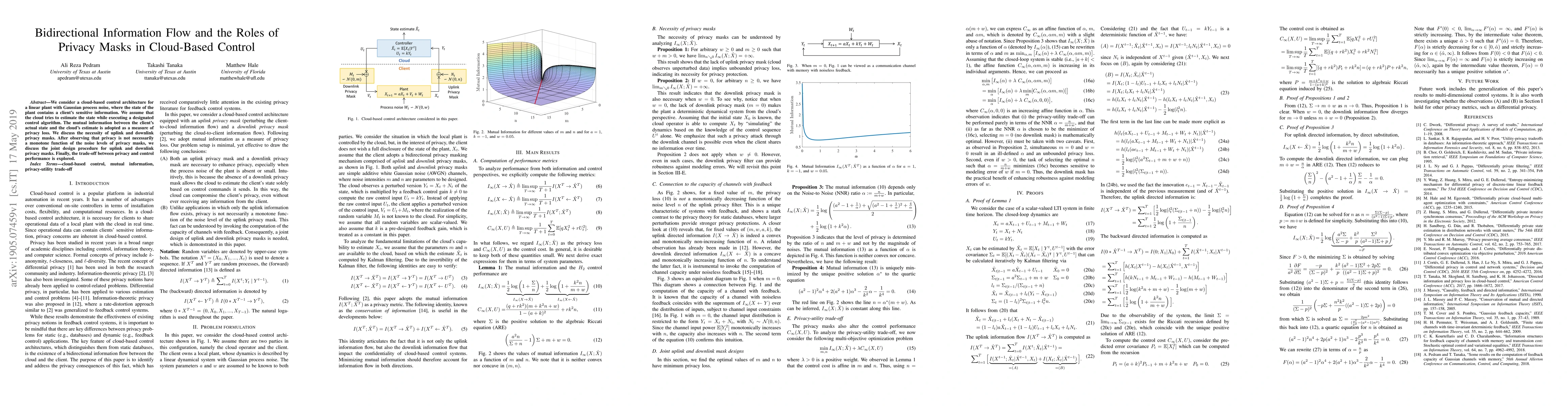 We consider a cloud-based control architecture for a linear plant with Gaussian process noise, where the state of the plant contains a client's sensitive information. We assume that the cloud tries to estimate the state while executing a designated control algorithm. The mutual information between the client's actual state and the cloud's estimate is adopted as a measure of privacy loss. We discuss the necessity of uplink and downlink privacy masks. After observing that privacy is not necessarily a monotone function of the noise levels of privacy masks, we discuss the joint design procedure for uplink and downlink privacy masks. Finally, the trade-off between privacy and control performance is explored.