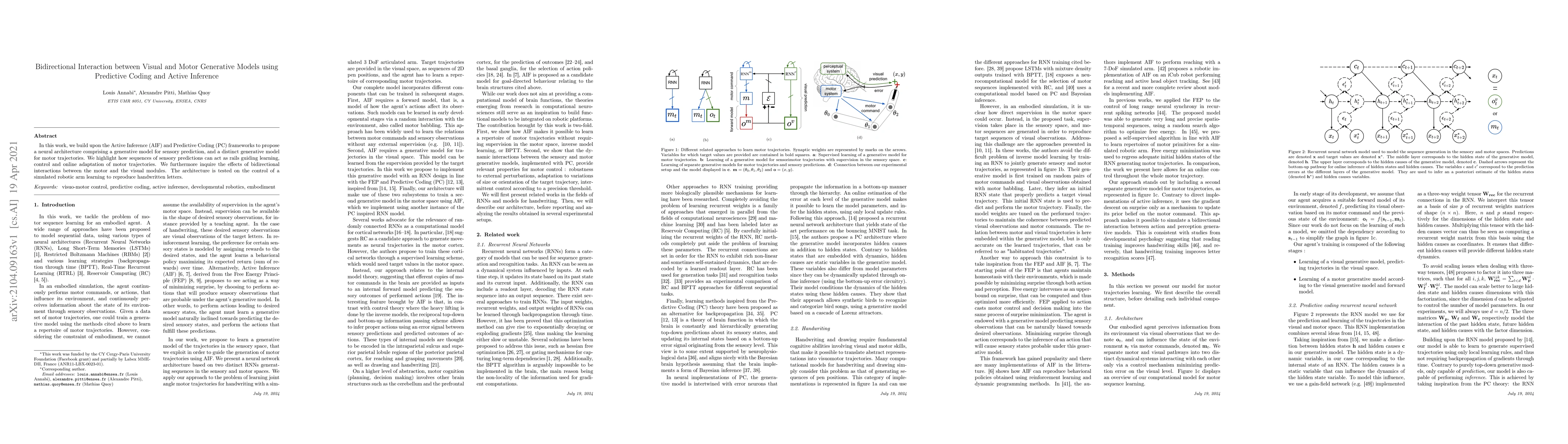 This paper proposes a neural architecture using Active Inference and Predictive Coding to integrate visual and motor generative models, demonstrating bidirectional interactions that guide motor trajectory learning and adaptation. The model is tested on a simulated robotic arm learning to reproduce handwritten letters.