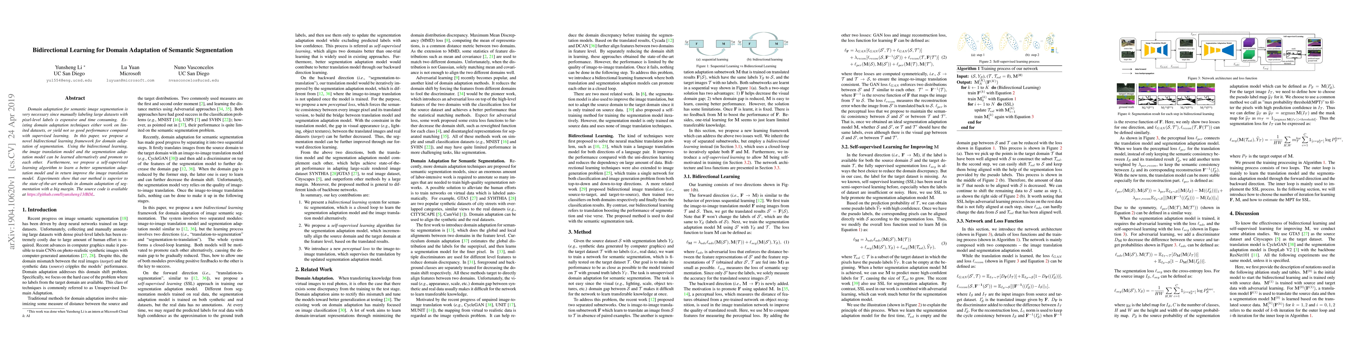 This paper introduces a bidirectional learning framework for domain adaptation in semantic segmentation, where an image translation model and a segmentation adaptation model are alternately optimized to enhance each other. A self-supervised learning algorithm is also proposed to further improve the segmentation adaptation model, achieving superior performance compared to existing methods.