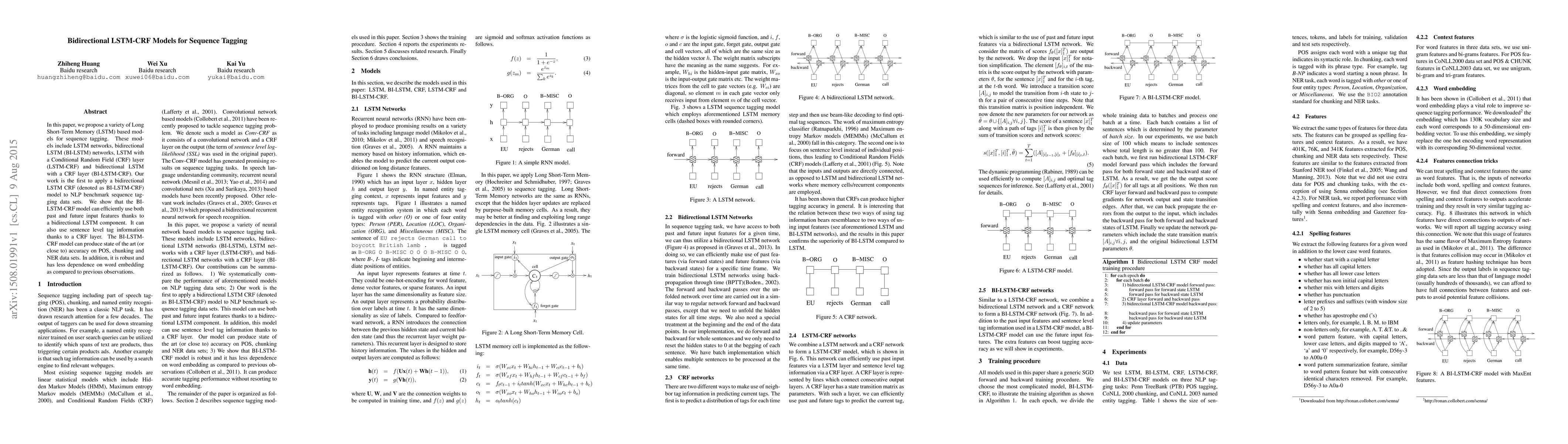 This paper introduces bidirectional LSTM-CRF models for sequence tagging, showing superior performance on NLP tasks like POS tagging, chunking, and NER. The BI-LSTM-CRF model efficiently leverages both past and future context and incorporates sentence-level tag information, achieving state-of-the-art accuracy while being less reliant on word embeddings.