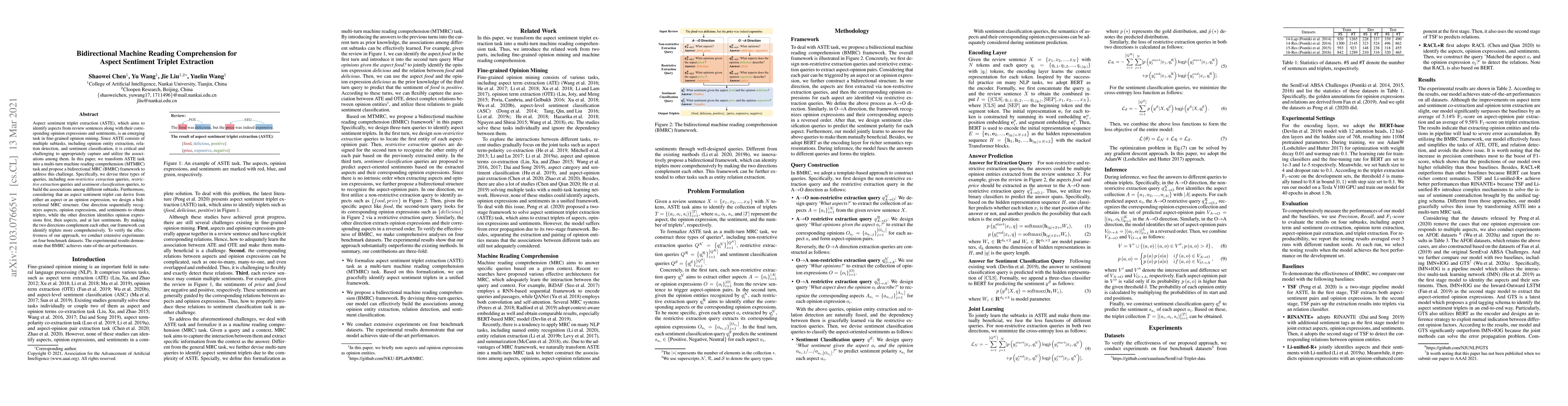 This paper proposes a bidirectional machine reading comprehension (BMRC) framework for aspect sentiment triplet extraction (ASTE), transforming ASTE into a multi-turn MRC task. The BMRC structure uses three types of queries to identify aspects, opinion expressions, and sentiments, achieving state-of-the-art performance on benchmark datasets.
