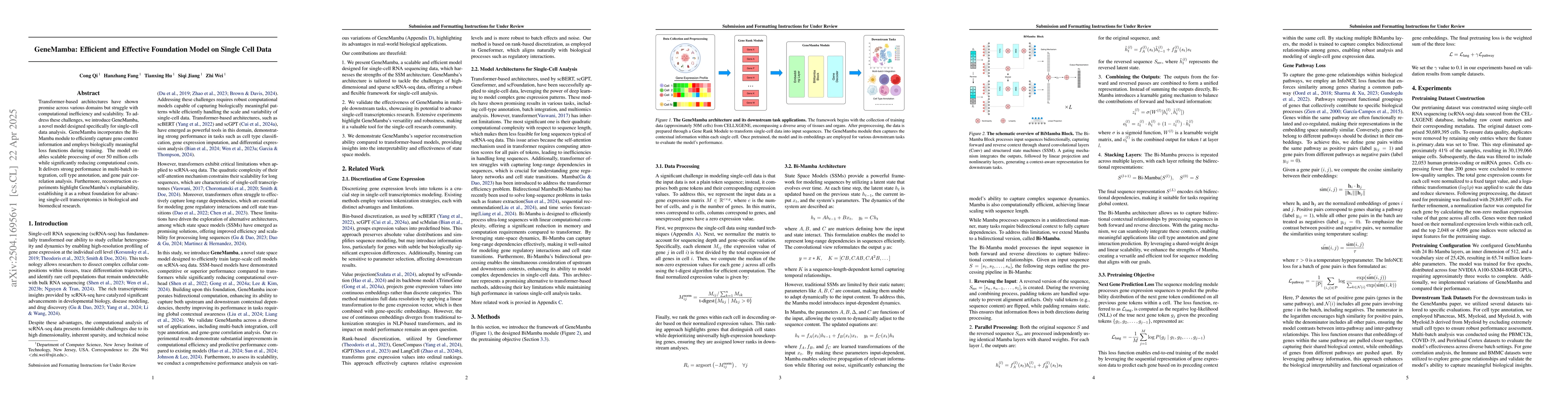 The research introduces GeneMamba, a scalable and efficient foundation model for single-cell transcriptomics built on state space modeling. It leverages the Bi-Mamba architecture to capture bidirectional gene context with linear-time complexity, offering substantial computational gains over transformer baselines. GeneMamba is pretrained on nearly 30 million cells and incorporates biologically informed objectives.
