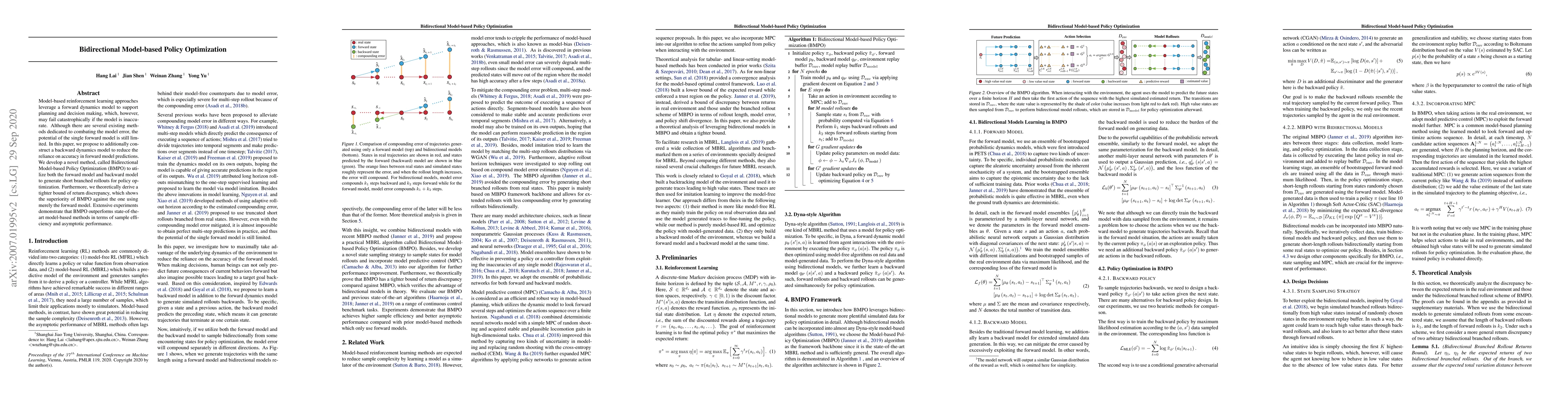 This paper proposes Bidirectional Model-based Policy Optimization (BMPO), which uses both forward and backward dynamics models to enhance reinforcement learning. BMPO generates short branched rollouts for policy optimization, reducing reliance on forward model accuracy, and demonstrates superior performance in sample efficiency and asymptotic results compared to methods using only a forward model.
