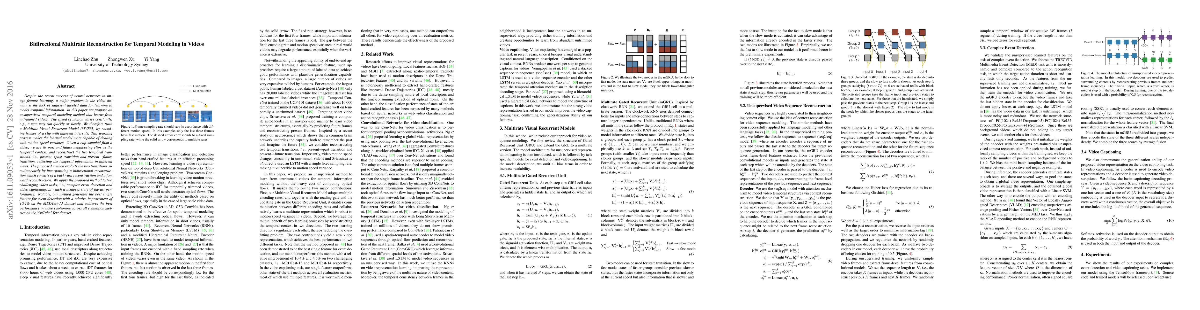 Despite the recent success of neural networks in image feature learning, a major problem in the video domain is the lack of sufficient labeled data for learning to model temporal information. In this paper, we propose an unsupervised temporal modeling method that learns from untrimmed videos. The speed of motion varies constantly, e.g., a man may run quickly or slowly. We therefore train a Multirate Visual Recurrent Model (MVRM) by encoding frames of a clip with different intervals. This learning process makes the learned model more capable of dealing with motion speed variance. Given a clip sampled from a video, we use its past and future neighboring clips as the temporal context, and reconstruct the two temporal transitions, i.e., present$\rightarrow$past transition and present$\rightarrow$future transition, reflecting the temporal information in different views. The proposed method exploits the two transitions simultaneously by incorporating a bidirectional reconstruction which consists of a backward reconstruction and a forward reconstruction. We apply the proposed method to two challenging video tasks, i.e., complex event detection and video captioning, in which it achieves state-of-the-art performance. Notably, our method generates the best single feature for event detection with a relative improvement of 10.4% on the MEDTest-13 dataset and achieves the best performance in video captioning across all evaluation metrics on the YouTube2Text dataset.