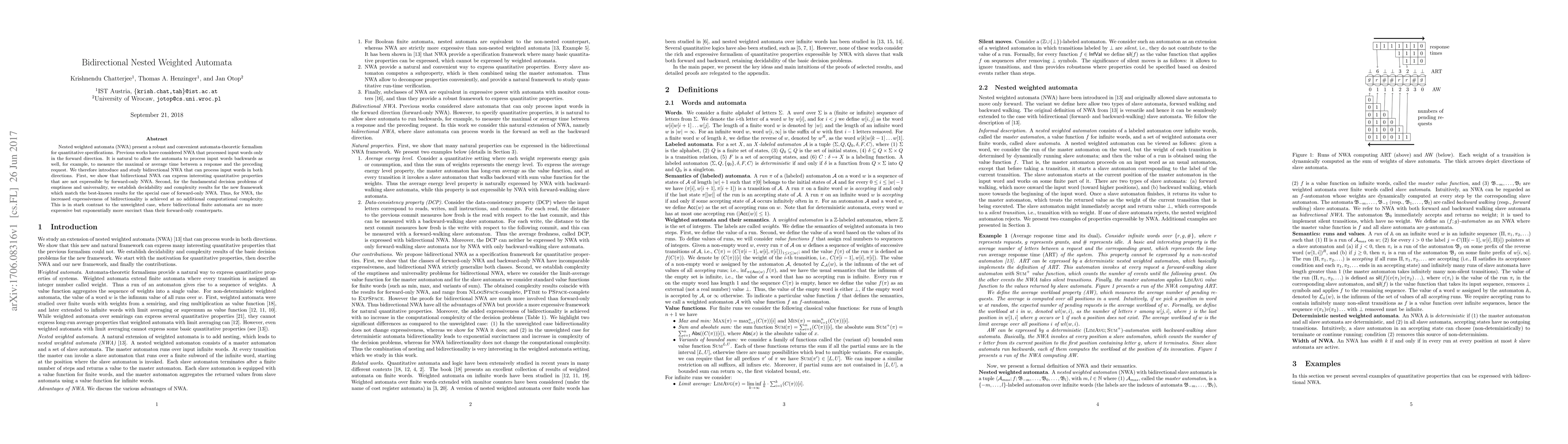 Nested weighted automata (NWA) present a robust and convenient automata-theoretic formalism for quantitative specifications. Previous works have considered NWA that processed input words only in the forward direction. It is natural to allow the automata to process input words backwards as well, for example, to measure the maximal or average time between a response and the preceding request. We therefore introduce and study bidirectional NWA that can process input words in both directions. First, we show that bidirectional NWA can express interesting quantitative properties that are not expressible by forward-only NWA. Second, for the fundamental decision problems of emptiness and universality, we establish decidability and complexity results for the new framework which match the best-known results for the special case of forward-only NWA. Thus, for NWA, the increased expressiveness of bidirectionality is achieved at no additional computational complexity. This is in stark contrast to the unweighted case, where bidirectional finite automata are no more expressive but exponentially more succinct than their forward-only counterparts.