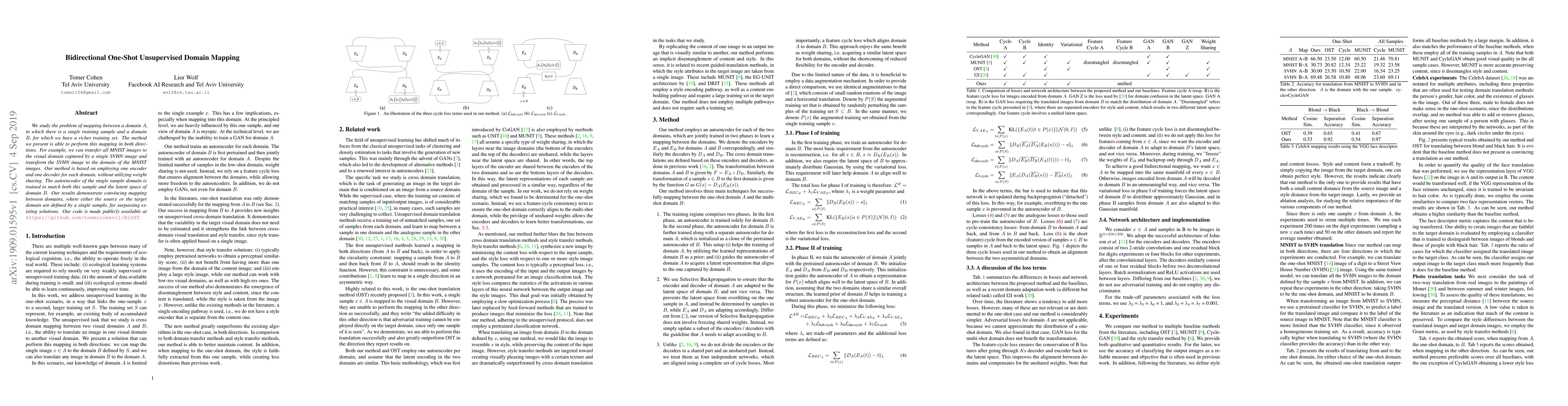 This research introduces a method for bidirectional unsupervised domain mapping between a domain with a single training sample (A) and another with a fuller training set (B). It employs one encoder and decoder per domain without weight sharing. The model learns to match the single sample's latent space with domain B's, demonstrating superior performance over existing solutions in tasks like transforming MNIST to SVHN domains.