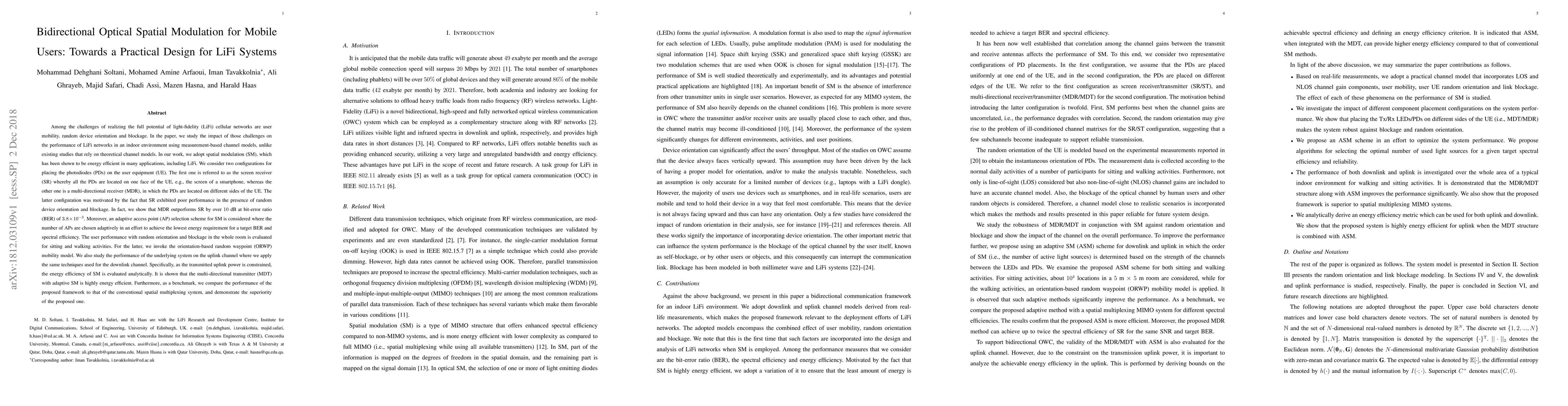 Among the challenges of realizing the full potential of light-fidelity (LiFi) cellular networks are user mobility, random device orientation and blockage. We study the impact of those challenges on the performance of LiFi in an indoor environment using measurement-based channel models. We adopt spatial modulation (SM), which has been shown to be energy efficient in many applications, including LiFi. We consider two configurations for placing the photodiodes (PDs) on the user equipment (UE). The first one is referred to as the screen receiver (SR) whereby all the PDs are located on one face of the UE, whereas the other one is a multi-directional receiver (MDR), in which the PDs are located on different sides of the UE. The latter configuration was motivated by the fact that SR exhibited poor performance in the presence of random device orientation and blockage. We show that MDR outperforms SR by over $10$ dB at BER of $3.8\times10^{-3}$. Moreover, an adaptive access point (AP) selection scheme for SM is considered where the number of APs are chosen adaptively in an effort to achieve the lowest energy requirement for a target BER and spectral efficiency. The user performance with random orientation and blockage in the whole room is evaluated for sitting and walking activities. For the latter, we invoke the orientation-based random waypoint (ORWP) mobility model. We also study the performance of the underlying system on the uplink channel where the same techniques are used for the downlink channel. Specifically, as the transmitted uplink power is constrained, the energy efficiency of SM is evaluated analytically. It is shown that the multi-directional transmitter (MDT) with adaptive SM is highly energy efficient. As a benchmark, we compare the performance of the proposed framework to that of the conventional spatial multiplexing system, and demonstrate the superiority of the proposed one.