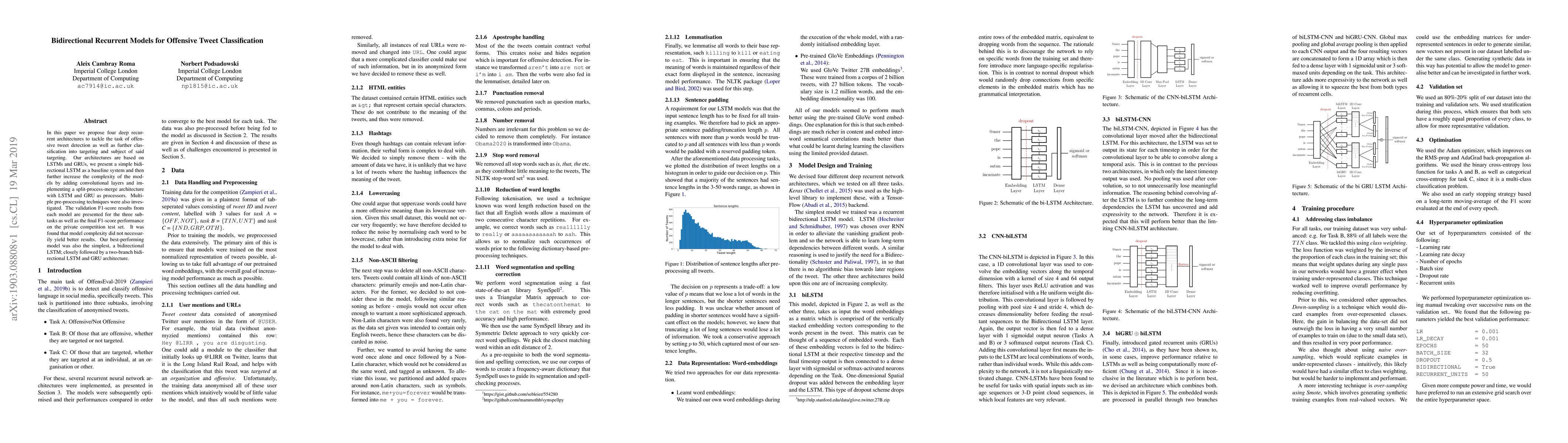 Researchers proposed four deep recurrent architectures to classify offensive tweets, finding that simpler models performed best, with a bidirectional LSTM achieving the top results.