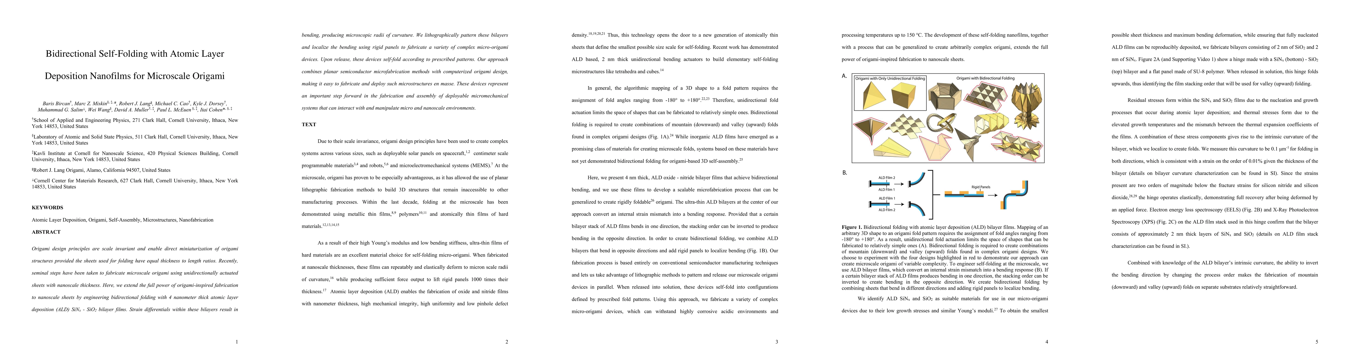 This paper presents a method for creating microscale origami devices using 4 nm thick atomic layer deposition (ALD) SiNx-SiO2 bilayer films that enable bidirectional self-folding. The patterned films achieve complex shapes through localized bending, allowing mass production of deployable micromechanical systems for manipulation at micro- and nanoscales.