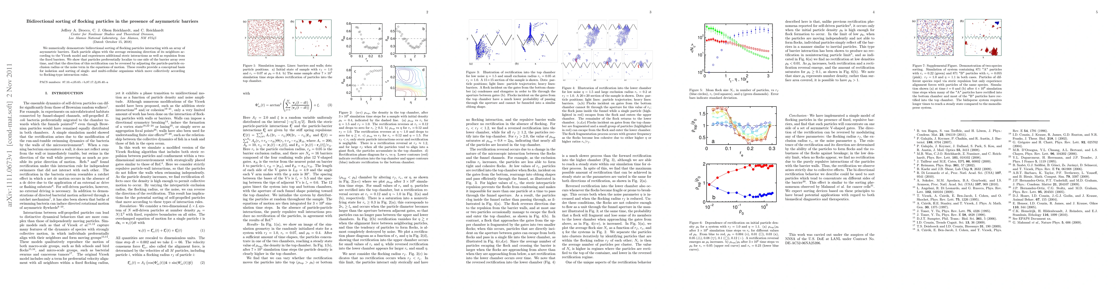 We numerically demonstrate bidirectional sorting of flocking particles interacting with an array of asymmetric barriers. Each particle aligns with the average swimming direction of its neighbors according to the Vicsek model and experiences additional steric interactions as well as repulsion from the fixed barriers. We show that particles preferentially localize to one side of the barrier array over time, and that the direction of this rectification can be reversed by adjusting the particle-particle exclusion radius or the noise term in the equations of motion. These results provide a conceptual basis for isolation and sorting of single- and multi-cellular organisms which move collectively according to flocking-type interaction rules.