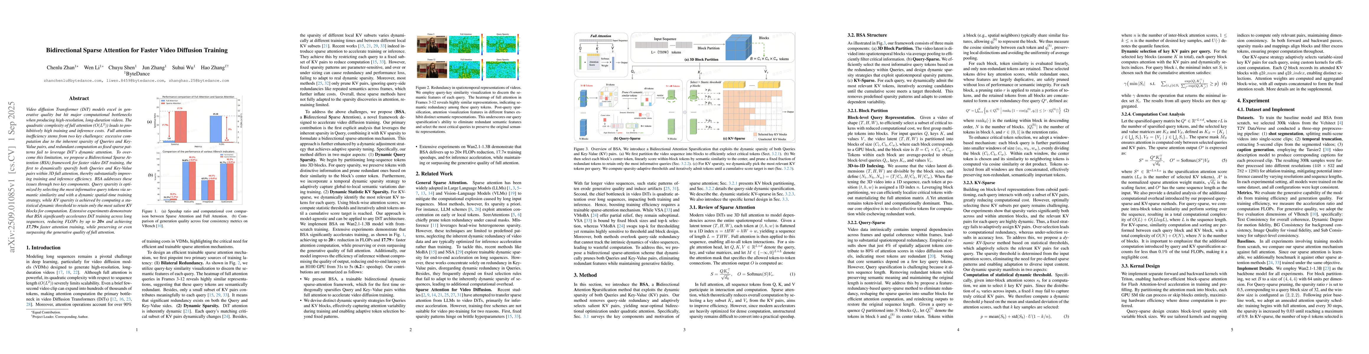 Video diffusion Transformer (DiT) models excel in generative quality but hit major computational bottlenecks when producing high-resolution, long-duration videos. The quadratic complexity of full attention leads to prohibitively high training and inference costs. Full attention inefficiency stems from two key challenges: excessive computation due to the inherent sparsity of Queries and Key-Value pairs, and redundant computation as fixed sparse patterns fail to leverage DiT's dynamic attention. To overcome this limitation, we propose a Bidirectional Sparse Attention (BSA) framework for faster video DiT training, the first to dynamically sparsify both Queries and Key-Value pairs within 3D full attention, thereby substantially improving training and inference efficiency. BSA addresses these issues through two key components. Query sparsity is optimized by selecting the most informative query tokens via semantic similarity and with a dynamic spatial-time training strategy, while KV sparsity is achieved by computing a statistical dynamic threshold to retain only the most salient KV blocks for computation. Extensive experiments demonstrate that BSA significantly accelerates DiT training across long sequences, reducing FLOPs by up to 20x and achieving 17.79x faster attention training, while preserving or even surpassing the generative quality of full attention.