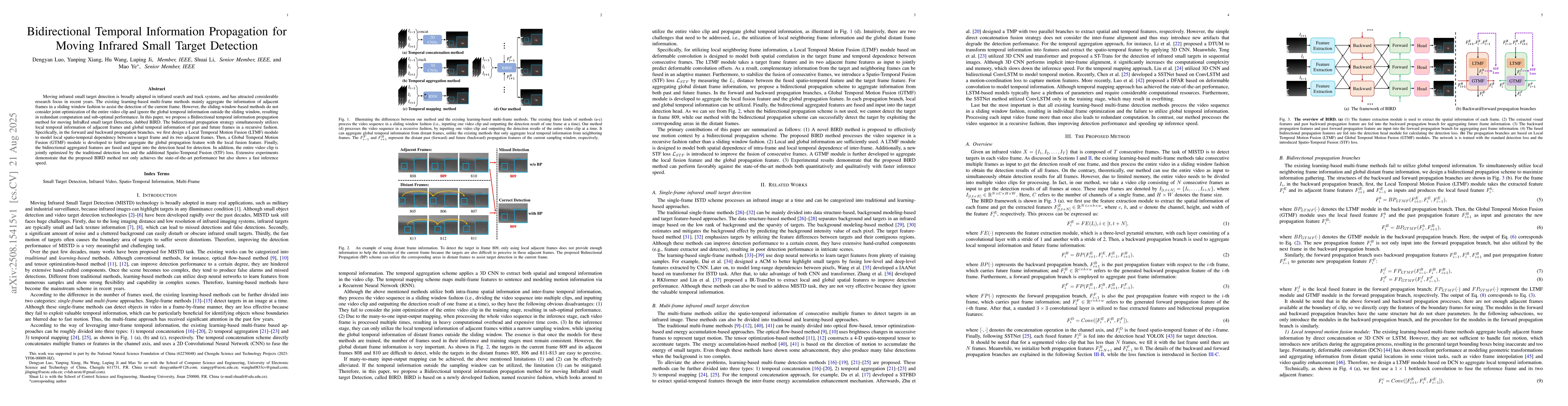 Moving infrared small target detection is broadly adopted in infrared search and track systems, and has attracted considerable research focus in recent years. The existing learning-based multi-frame methods mainly aggregate the information of adjacent frames in a sliding window fashion to assist the detection of the current frame. However, the sliding-window-based methods do not consider joint optimization of the entire video clip and ignore the global temporal information outside the sliding window, resulting in redundant computation and sub-optimal performance. In this paper, we propose a Bidirectional temporal information propagation method for moving InfraRed small target Detection, dubbed BIRD. The bidirectional propagation strategy simultaneously utilizes local temporal information of adjacent frames and global temporal information of past and future frames in a recursive fashion. Specifically, in the forward and backward propagation branches, we first design a Local Temporal Motion Fusion (LTMF) module to model local spatio-temporal dependency between a target frame and its two adjacent frames. Then, a Global Temporal Motion Fusion (GTMF) module is developed to further aggregate the global propagation feature with the local fusion feature. Finally, the bidirectional aggregated features are fused and input into the detection head for detection. In addition, the entire video clip is jointly optimized by the traditional detection loss and the additional Spatio-Temporal Fusion (STF) loss. Extensive experiments demonstrate that the proposed BIRD method not only achieves the state-of-the-art performance but also shows a fast inference speed.