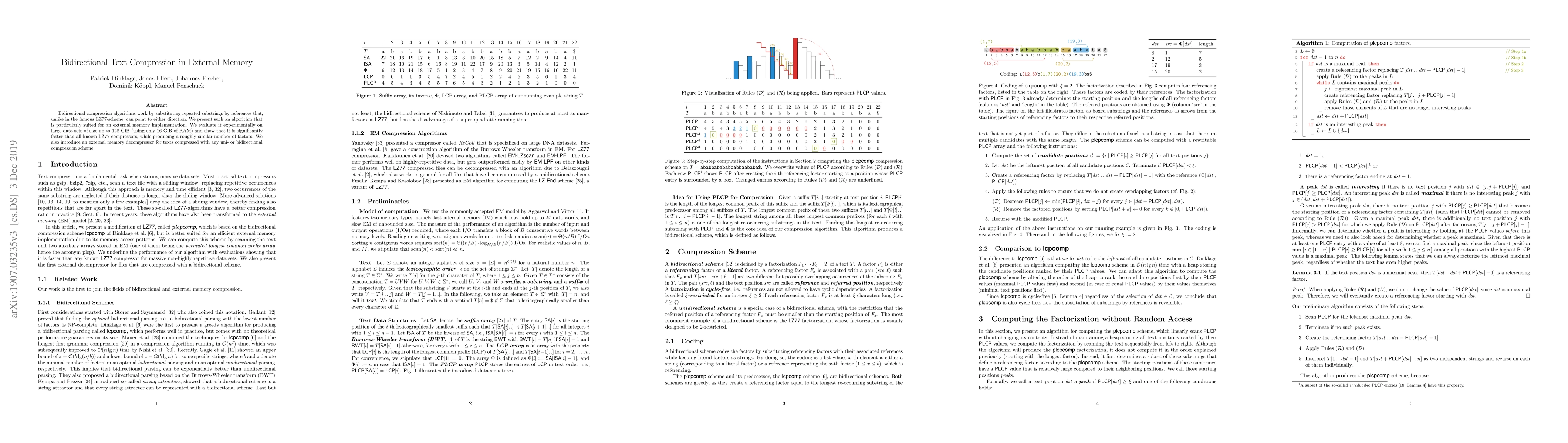 This paper presents a bidirectional text compression algorithm designed for external memory, which outperforms traditional LZ77 compressors in speed while maintaining comparable factor counts. The algorithm is evaluated on large datasets, demonstrating its efficiency with limited RAM usage.