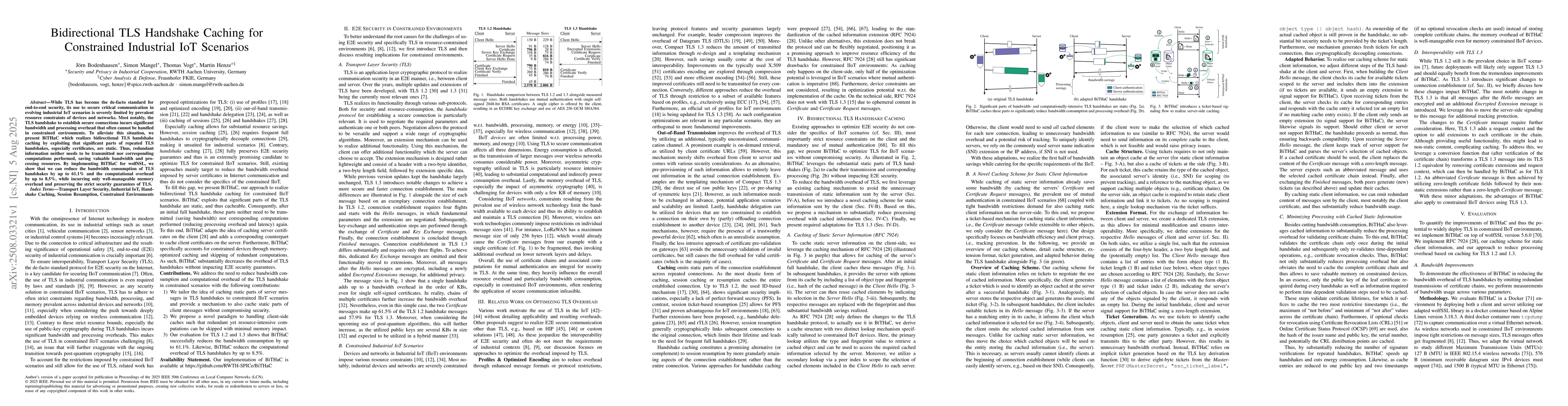 While TLS has become the de-facto standard for end-to-end security, its use to secure critical communication in evolving industrial IoT scenarios is severely limited by prevalent resource constraints of devices and networks. Most notably, the TLS handshake to establish secure connections incurs significant bandwidth and processing overhead that often cannot be handled in constrained environments. To alleviate this situation, we present BiTHaC which realizes bidirectional TLS handshake caching by exploiting that significant parts of repeated TLS handshakes, especially certificates, are static. Thus, redundant information neither needs to be transmitted nor corresponding computations performed, saving valuable bandwidth and processing resources. By implementing BiTHaC for wolfSSL, we show that we can reduce the bandwidth consumption of TLS handshakes by up to 61.1% and the computational overhead by up to 8.5%, while incurring only well-manageable memory overhead and preserving the strict security guarantees of TLS.