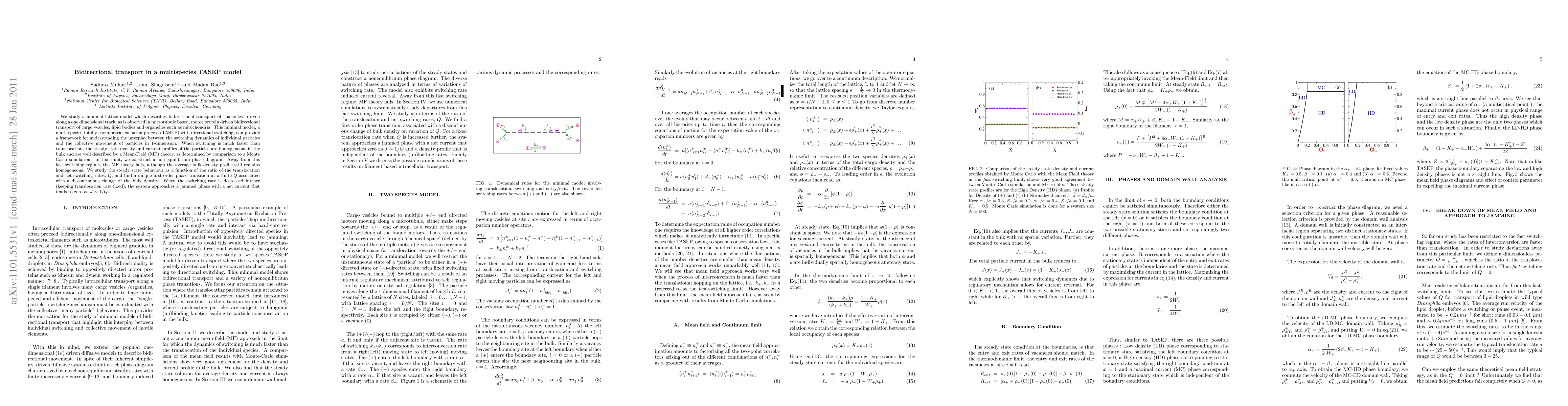 We study a minimal lattice model which describes bidirectional transport of "particles" driven along a one dimensional track, as is observed in microtubule based, motor protein driven bidirectional transport of cargo vesicles, lipid bodies and organelles such as mitochondria. This minimal model, a multi-species totally asymmetric exclusion process (TASEP) with directional switching, can provide a framework for understanding the interplay between the switching dynamics of individual particles and the collective movement of particles in 1-dimension. When switching is much faster than translocation, the steady state density and current profiles of the particles are homogeneous in the bulk and are well described by a Mean-Field (MF) theory, as determined by comparison to a Monte Carlo simulation. In this limit, we construct a non-equilibrium phase diagram. Away from this fast switching regime, the MF theory fails, although the average bulk density profile still remains homogeneous. We study the steady state behaviour as a function of the ratio of the translocation and net switching rates, Q, and find a unique first-order phase transition at a finite Q associated with a discontinuous change of the bulk density. When the switching rate is decreased further (keeping translocation rate fixed), the system approaches a jammed phase with a net current that tends to zero as J ~ 1/Q.