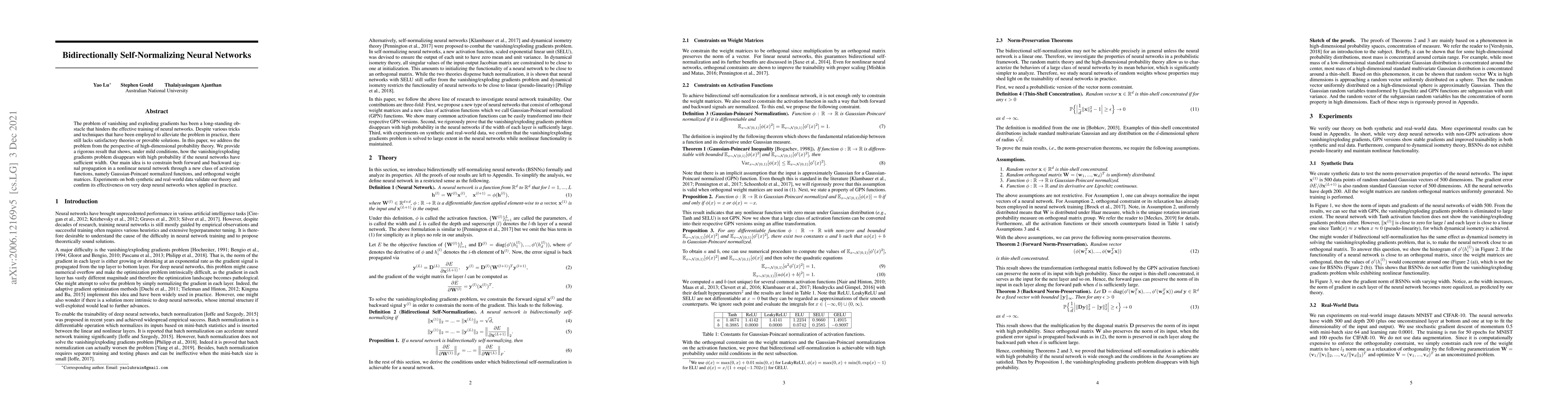 The paper proposes Bidirectionally Self-Normalizing Neural Networks (BSNNs) that constrain both forward and backward signal propagation using Gaussian-Poincaré normalized functions and orthogonal weight matrices, addressing the vanishing/exploding gradients problem.