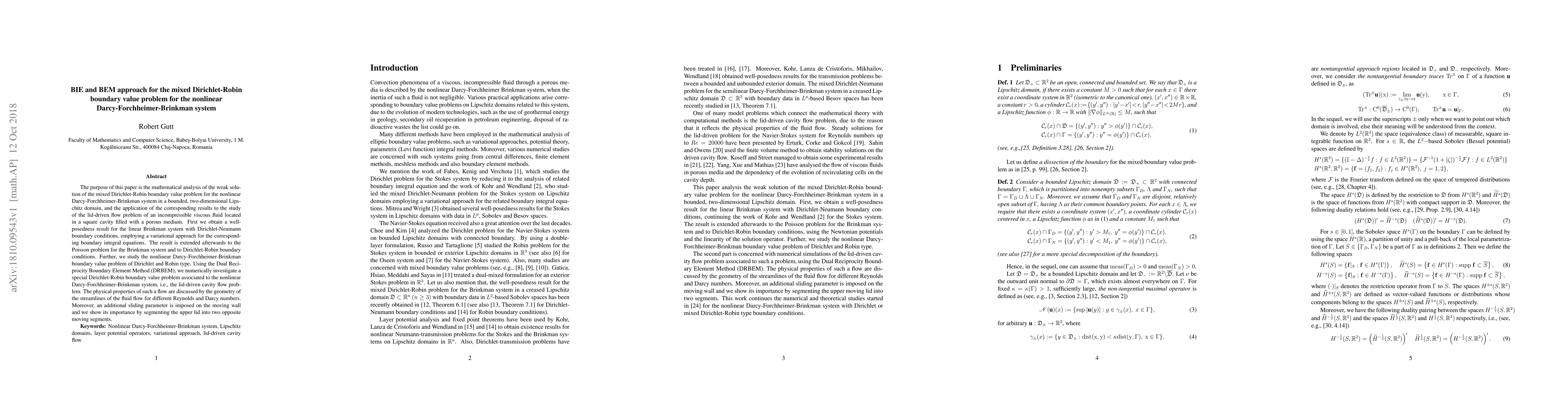 The purpose of this paper is the mathematical analysis of the weak solution of the mixed Dirichlet-Robin boundary value problem for the nonlinear Darcy-Forchheimer- Brinkman system in a bounded, two-dimensional Lipschitz domain, and the application of the corresponding results to the study of the lid-driven flow problem of an incompressible viscous fluid located in a square cavity filled with a porous medium. First we obtain a well-posedness result for the linear Brinkman system with Dirichlet-Neumann boundary conditions, employing a variational approach for the corresponding boundary integral equations. The result is extended afterwards to the Poisson problem for the Brinkman system and to Dirichlet- Robin boundary conditions. Further, we study the nonlinear Darcy-Forchheimer- Brinkman boundary value problem of Dirichlet and Robin type. Using the Dual Reciprocity Boundary Element Method (DRBEM), we numerically investigate a special Dirichlet-Robin boundary value problem associated to the nonlinear Darcy-Forchheimer-Brinkman system, i.e., the lid-driven cavity flow problem. The physical properties of such a flow are discussed by the geometry of the streamlines of the fluid flow for different Reynolds and Darcy numbers. Moreover, an additional sliding parameter is imposed on the moving wall and we show its importance by segmenting the upper lid into two opposite moving segments.