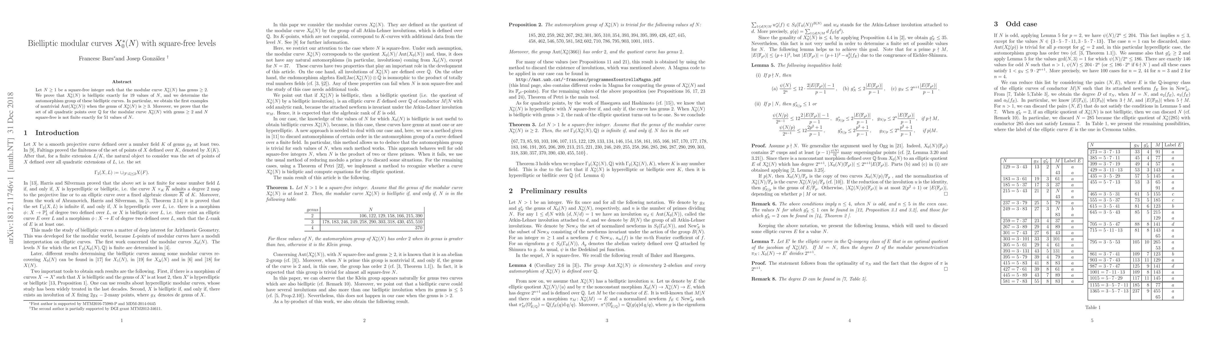 Let $N\geq 1$ be a square-free integer such that the modular curve $X_0^*(N)$ has genus $\geq 2$. We prove that $X_0^*(N)$ is bielliptic exactly for $19$ values of $N$, and we determine the automorphism group of these bielliptic curves. In particular, we obtain the first examples of nontrivial $Aut(X_0^*(N))$ when the genus of $X_0^*(N)$ is $\geq 3$. Moreover, we prove that the set of all quadratic points over $\mathbb{Q}$ for the modular curve $X_0^*(N)$ with genus $\geq 2$ and $N$ square-free is not finite exactly for $51$ values of $N$.