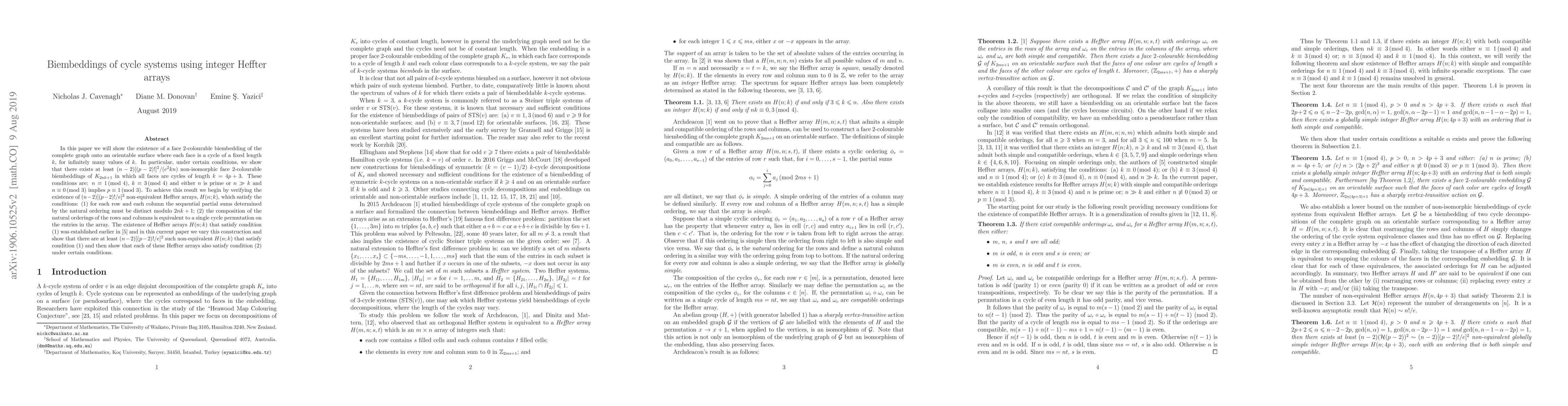 In this paper we will show the existence of a face $2$-colourable biembedding of the complete graph onto an orientable surface where each face is a cycle of a fixed length $k$, for infinitely many values of $k$. In particular, under certain conditions, we show that there exists at least $(n-2)[(p-2)!]^2/(e^2 kn)$ non-isomorphic face $2$-colourable biembeddings of $K_{2nk+1}$ in which all faces are cycles of length $k=4p+3$. These conditions are: $n\equiv 1\mod 4$, $k\equiv 3\mod 4$ and either $n$ is prime or $n\gg k$ and $n\equiv 0\mod 3$ implies $p\equiv 1\mod 3$. To achieve this result we begin by verifying the existence of $(n-2)[(p-2)!/e]^2$ non-equivalent Heffter arrays, $H(n;k)$, which satisfy the conditions: (1) for each row and each column the sequential partial sums determined by the natural ordering must be distinct modulo $2nk+1$; (2) the composition of the natural orderings of the rows and columns is equivalent to a single cycle permutation on the entries in the array. The existence of Heffter arrays $H(n;k)$ that satisfy condition (1) was established earlier in \cite{BCDY} and in this current paper we vary this construction and show that there are at least $(n-2)[(p-2)!/e]^2$ such non-equivalent $H(n;k)$ that satisfy condition (1) and then show that each of these Heffter arrays also satisfy condition (2) under certain conditions.