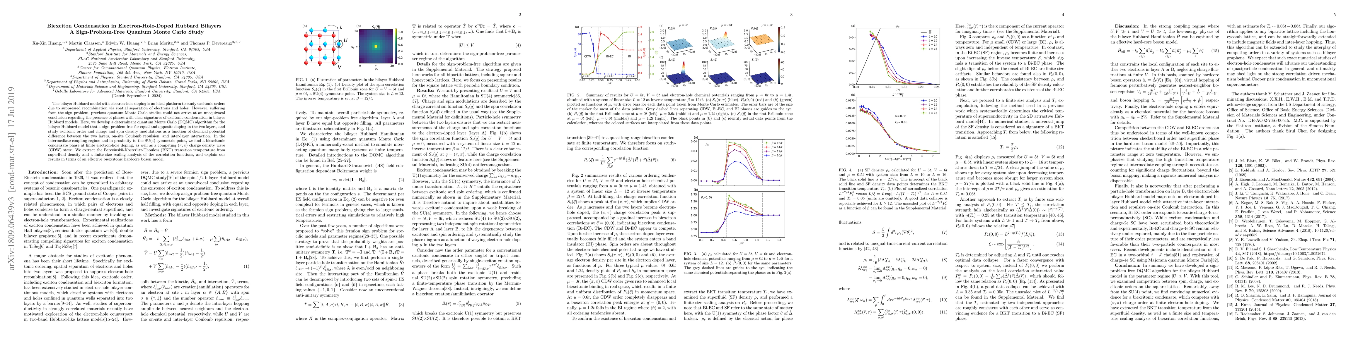 The bilayer Hubbard model with electron-hole doping is an ideal platform to study excitonic orders due to suppressed recombination via spatial separation of electrons and holes. However, suffering from the sign problem, previous quantum Monte Carlo studies could not arrive at an unequivocal conclusion regarding the presence of phases with clear signatures of excitonic condensation in bilayer Hubbard models. Here, we develop a determinant quantum Monte Carlo (DQMC) algorithm for the bilayer Hubbard model that is sign-problem-free for equal and opposite doping in the two layers, and study excitonic order and charge and spin density modulations as a function of chemical potential difference between the two layers, on-site Coulomb repulsion, and inter-layer interaction. In the intermediate coupling regime and in proximity to the SU(4)-symmetric point, we find a biexcitonic condensate phase at finite electron-hole doping, as well as a competing $(\pi,\pi)$ charge density wave (CDW) state. We extract the Berezinskii-Kosterlitz-Thouless (BKT) transition temperature from superfluid density and a finite size scaling analysis of the correlation functions, and explain our results in terms of an effective biexcitonic hardcore boson model.